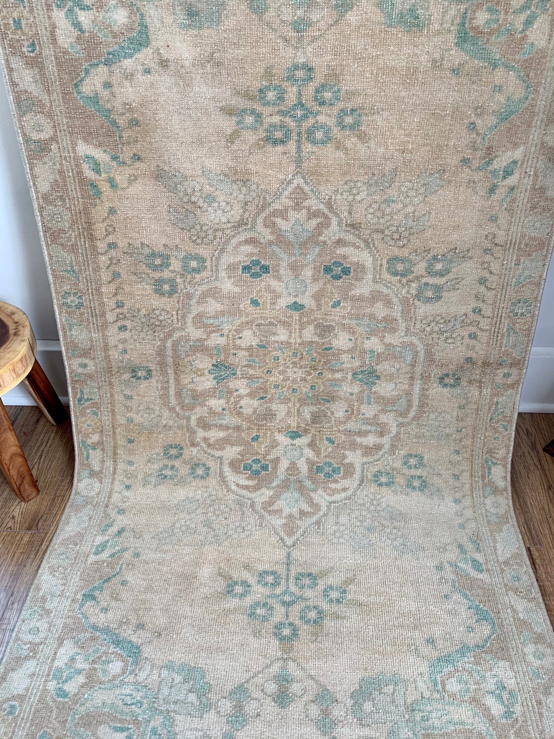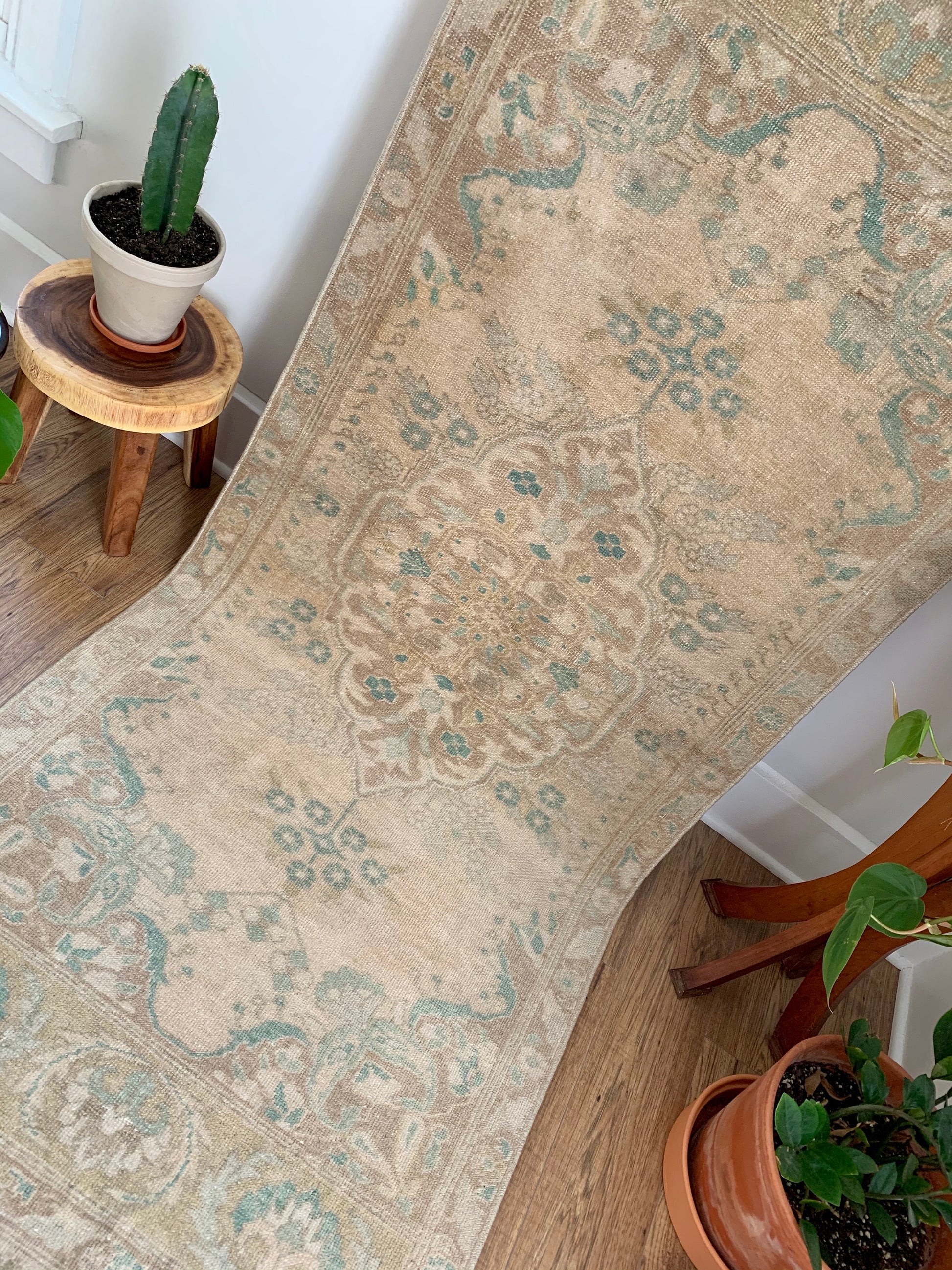 Cleaning: Vacuum on occasion, with suction only. Spot clean with clear soap, a little bit of white vinegar, and water. Never use a carpet cleaner machine to clean a vintage rug. If your piece is fragile or antique, or needs a deep clean, take it to a professional.