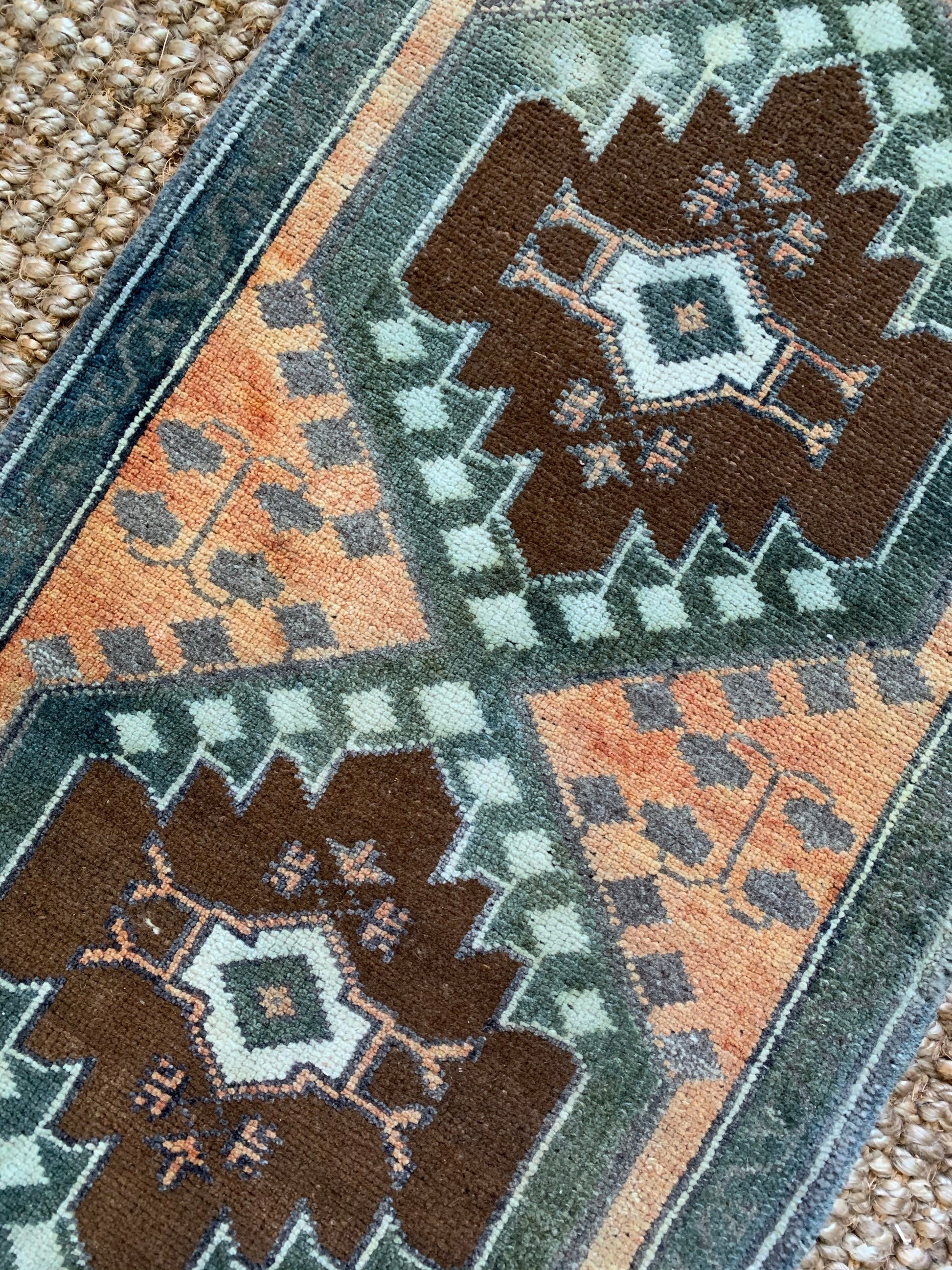 All rugs have been thoroughly cleaned; age-related wear and patina are considered normal in these unique, hand woven vintage rugs. All pieces have been photographed with moderate natural light. Colors may vary depending on your phone or screen settings. Some items may not be perfectly straight or rectangle. We consider these characteristics part of what makes them truly one-of-a-kind.