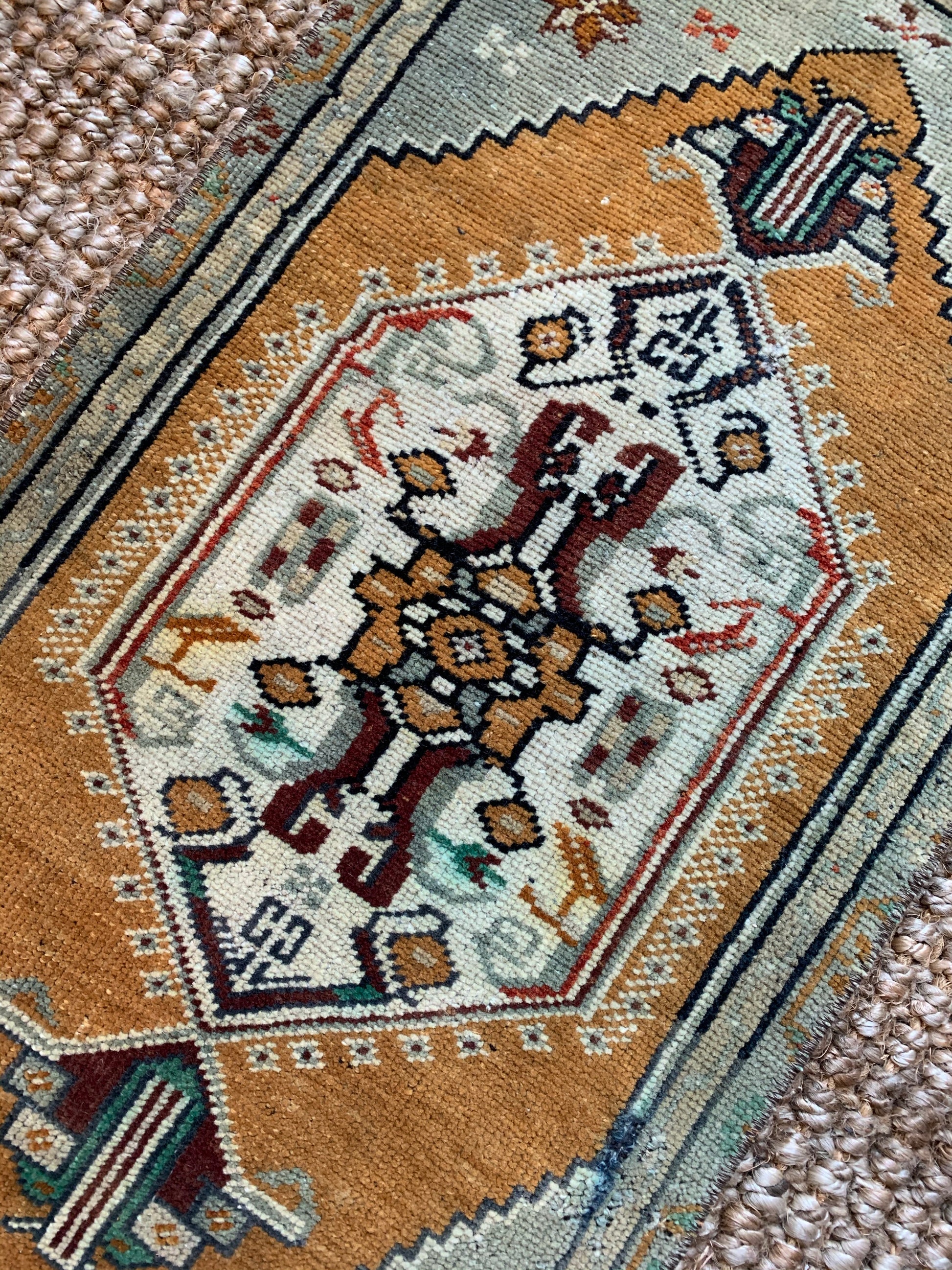 All rugs have been thoroughly cleaned; age-related wear and patina are considered normal in these unique, hand woven vintage rugs. All pieces have been photographed with moderate natural light. Colors may vary depending on your phone or screen settings. Some items may not be perfectly straight or rectangle. We consider these characteristics part of what makes them truly one-of-a-kind.