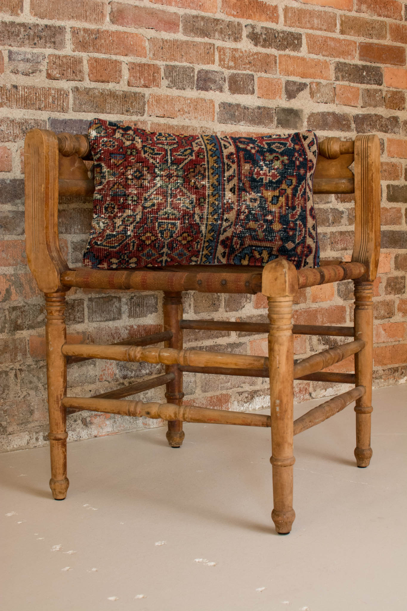 Wool rug face with coordinating fabric backing. All sizes are approximate. Age-related wear and patina are considered normal in these unique, hand woven pieces. All items have been photographed with moderate natural light. Colors may vary depending on your phone or screen settings. Some items may not be perfectly straight. We consider these characteristics part of what makes them truly one-of-a-kind.