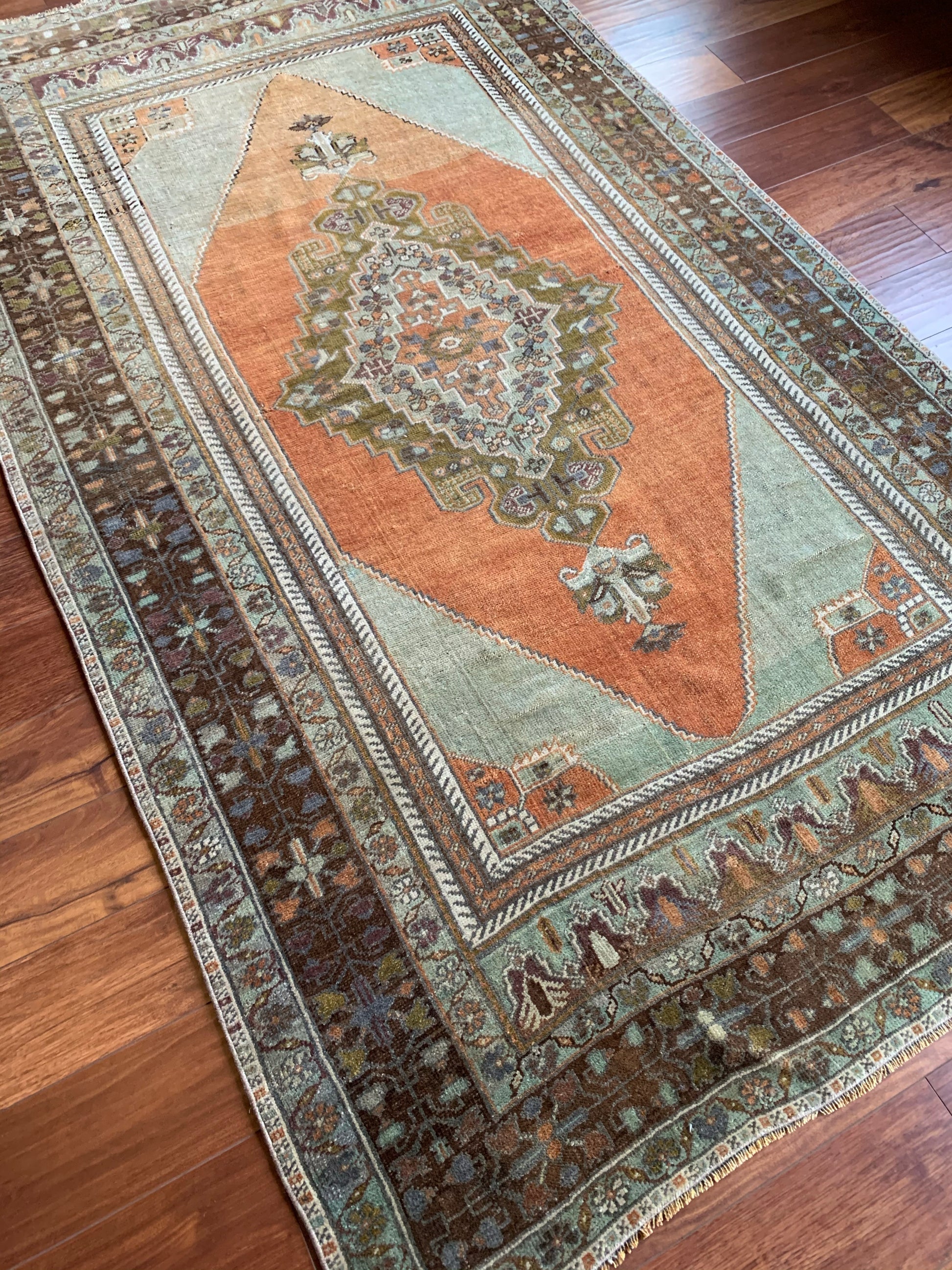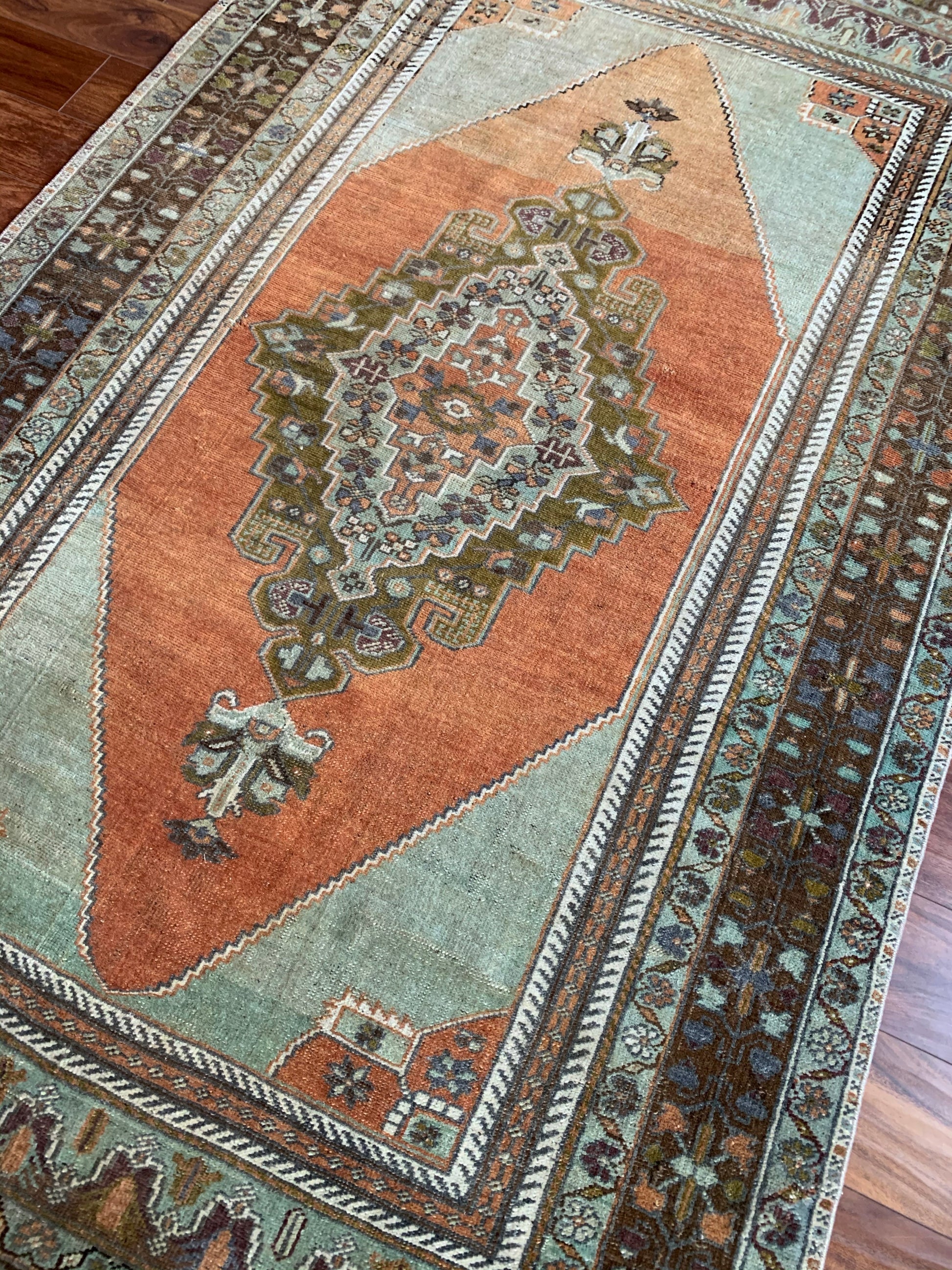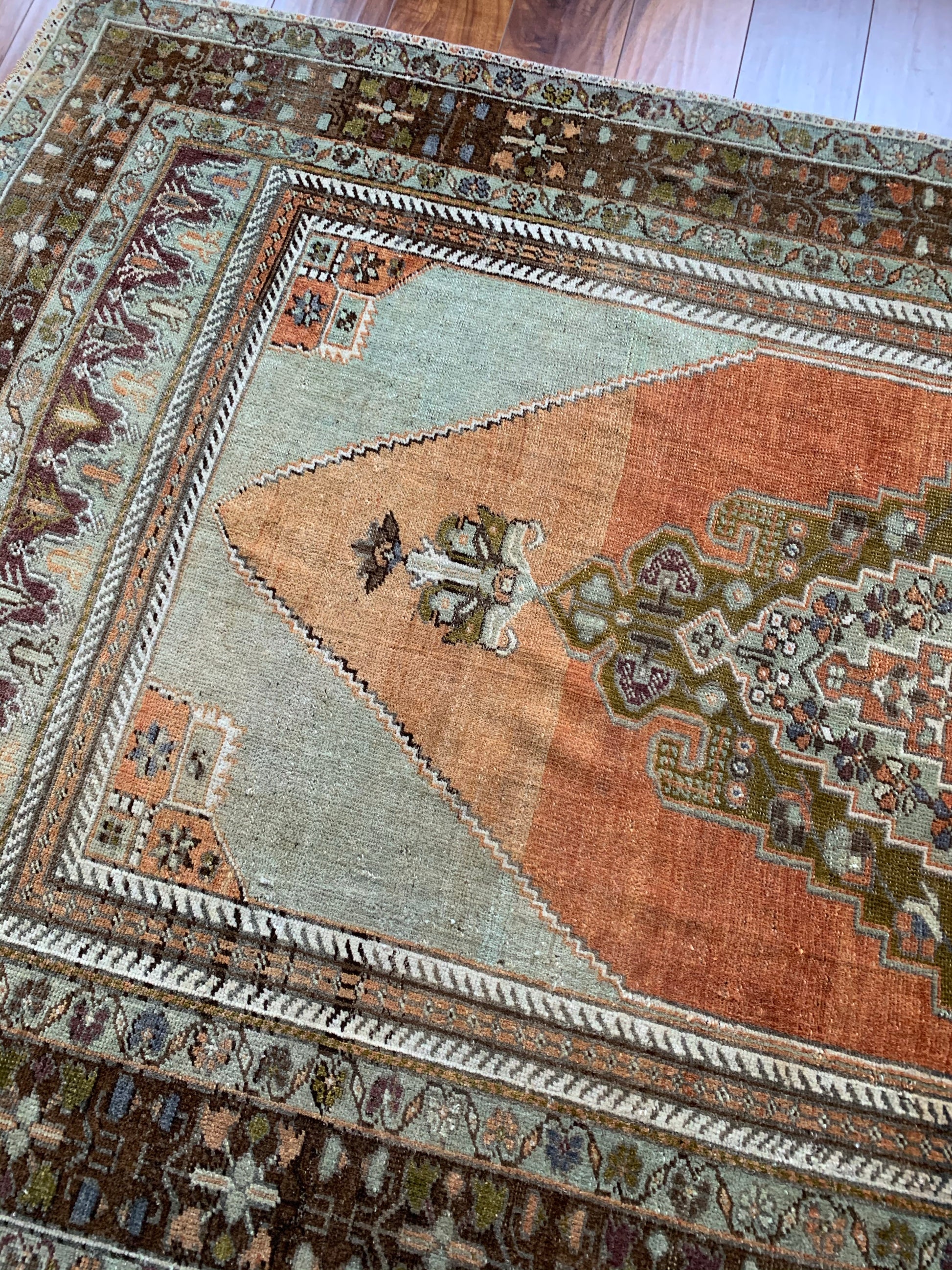 All rugs have been thoroughly cleaned; age-related wear and patina are considered normal in these unique, hand woven vintage rugs. All pieces have been photographed with moderate natural light. Colors may vary depending on your phone or screen settings. Some items may not be perfectly straight or rectangle. We consider these characteristics part of what makes them truly one-of-a-kind.