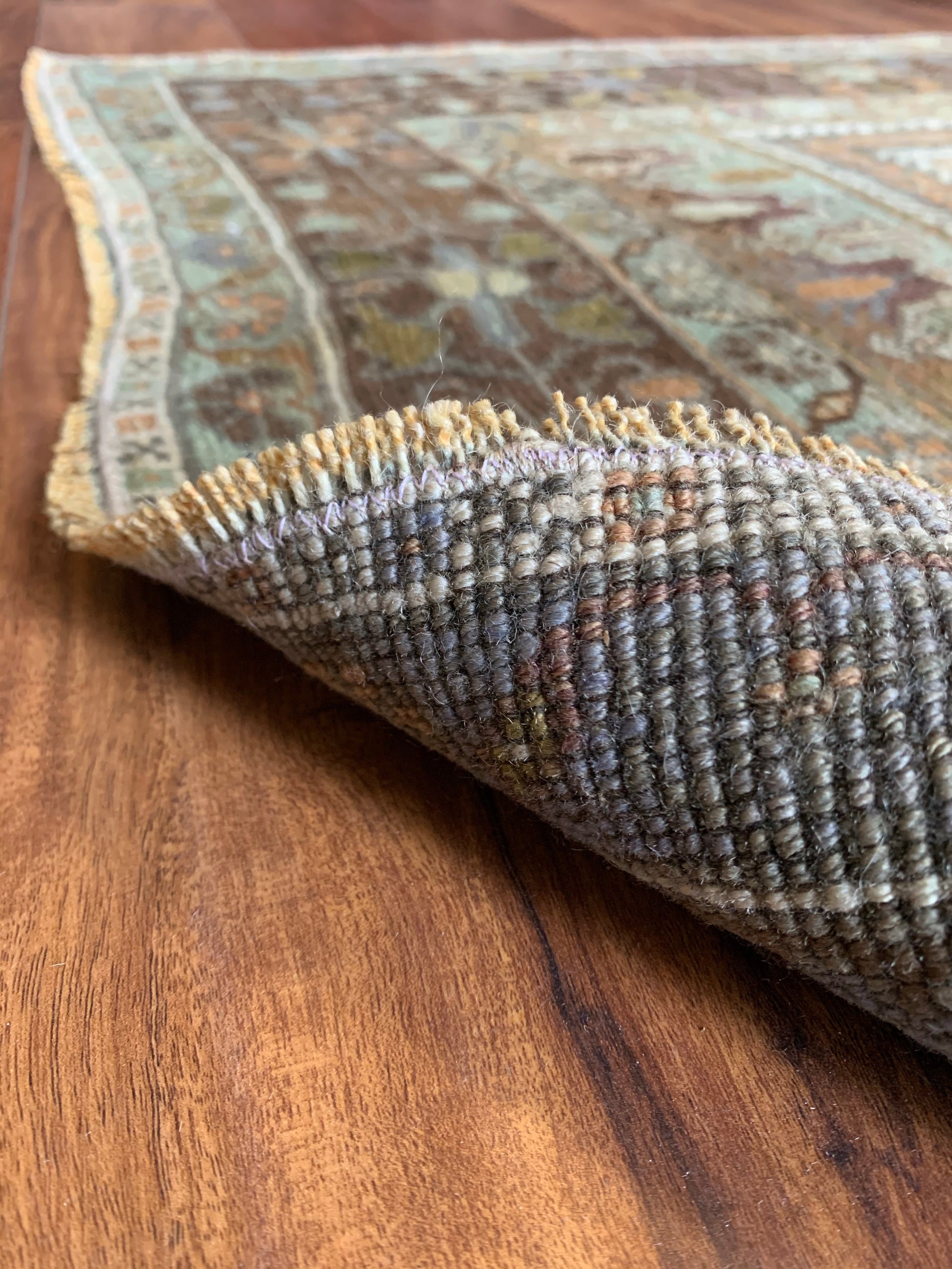 Each rug listed on our site is either wool pile on a cotton foundation, or wool pile on a wool foundation. Quality, unrefined wool contains a substance called lanolin. Lanolin tends to have a natural smell, which many compare to the smell of sheep – or almost metallic-y, but sweet and grassy.
