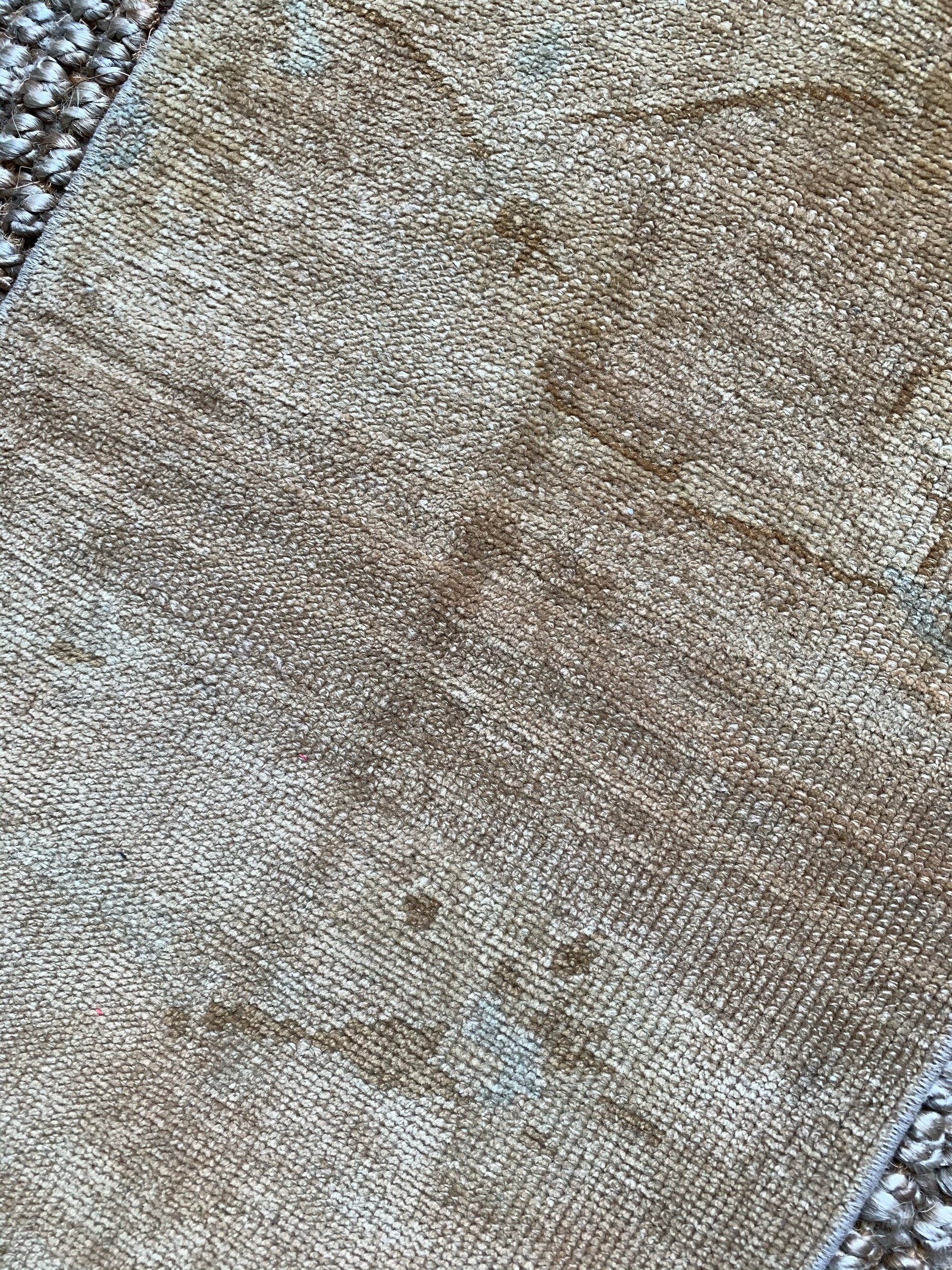 Cleaning: Vacuum on occasion, with suction only. Spot clean with clear soap, a little bit of white vinegar, and water. Never use a carpet cleaner machine to clean a vintage rug. If your piece is fragile or antique, or needs a deep clean, take it to a professional.