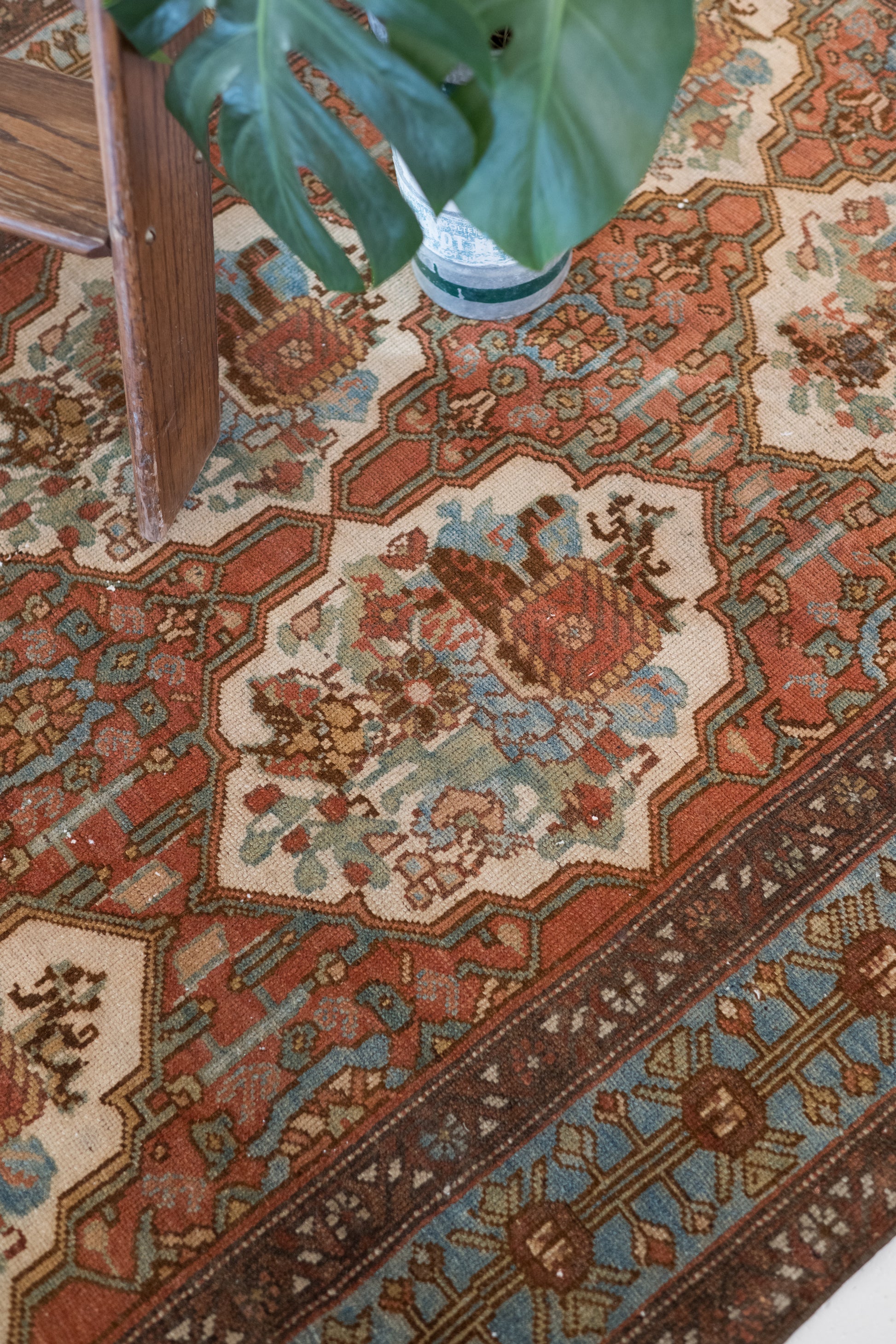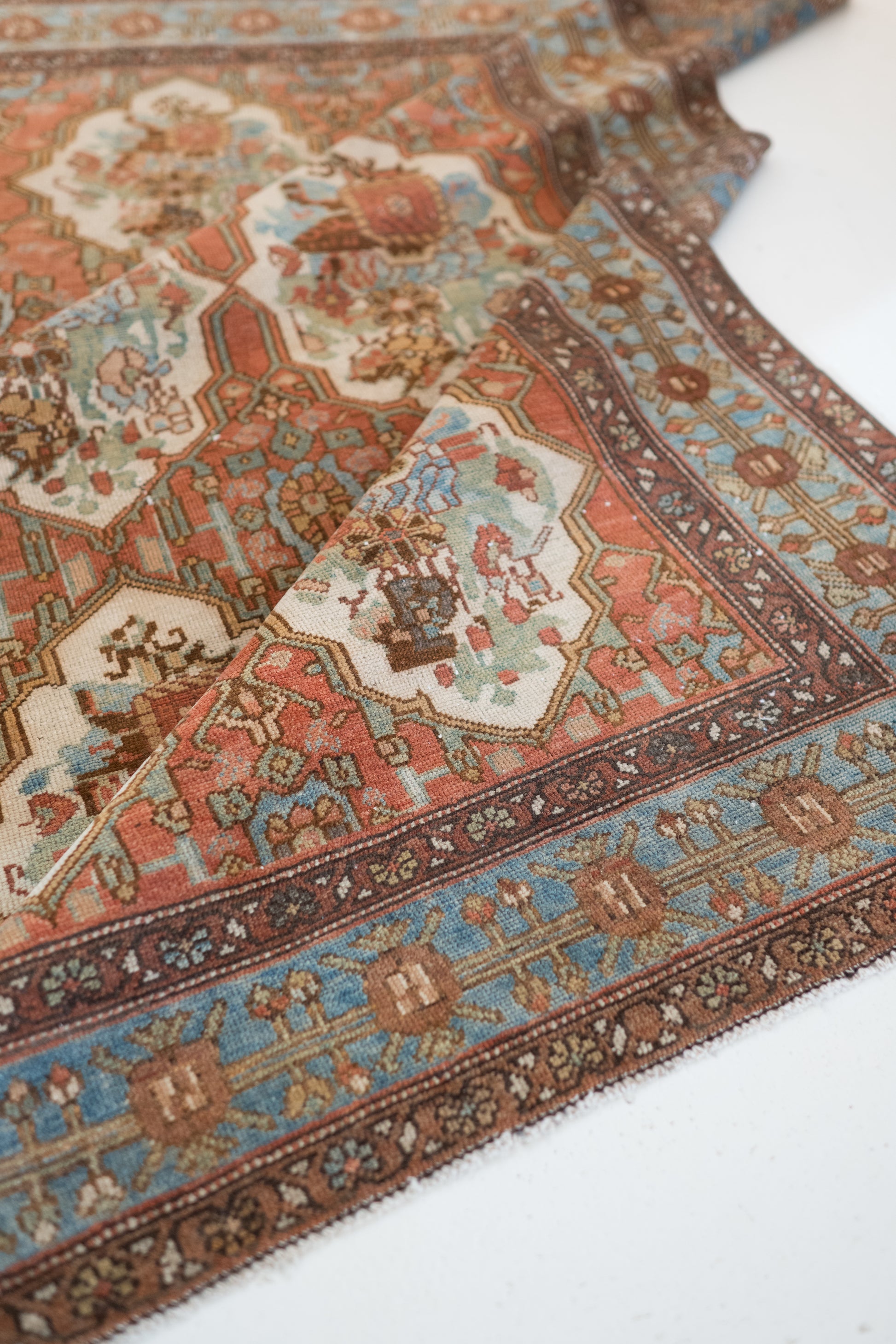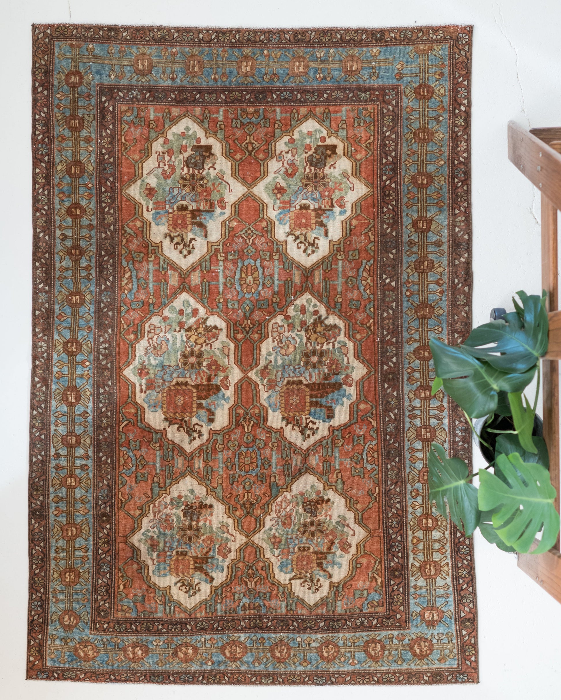 Elevate your space with the rare Bakhtiari pattern and stunning vegetable dyes of our Libby rug. Its French blue border accentuates six beautiful floral medallions, adding a touch of charm and character to any room. Made with wool on a cotton foundation, it boasts a low pile for a cozy and durable feel.