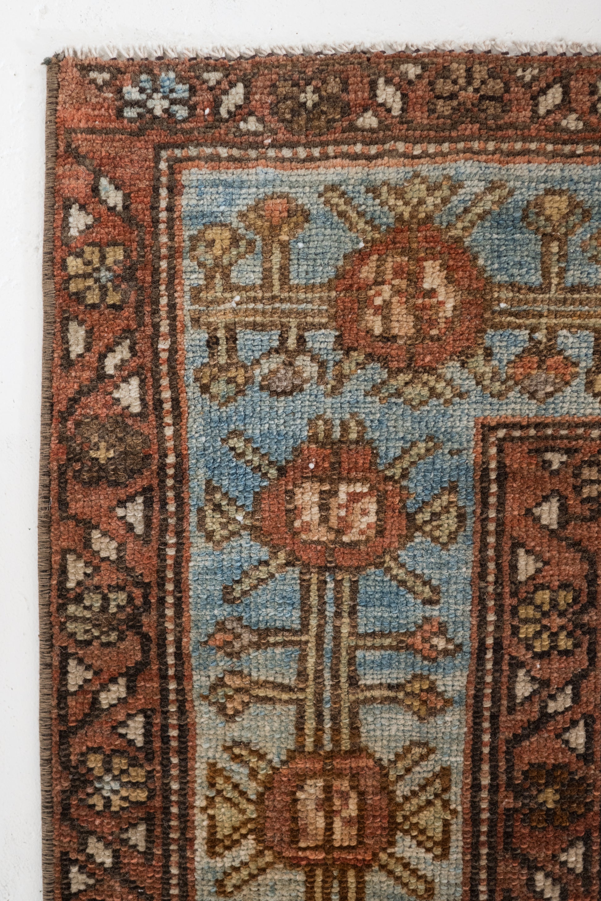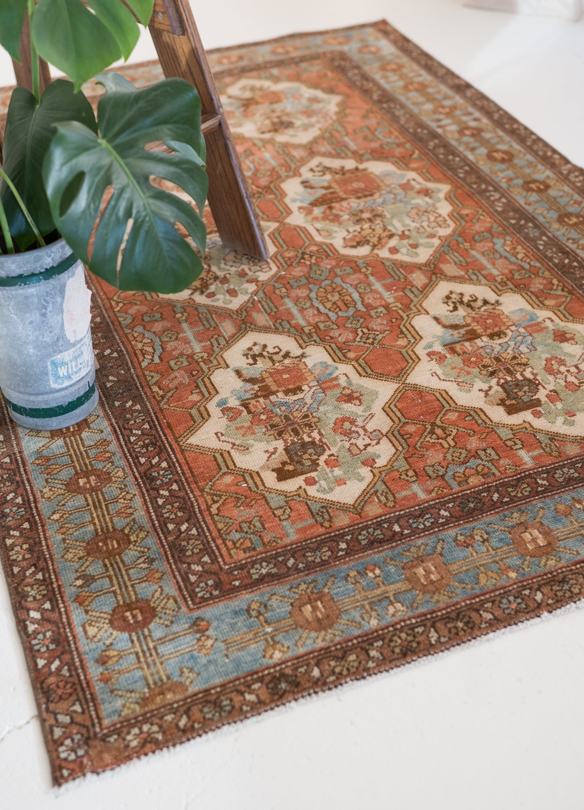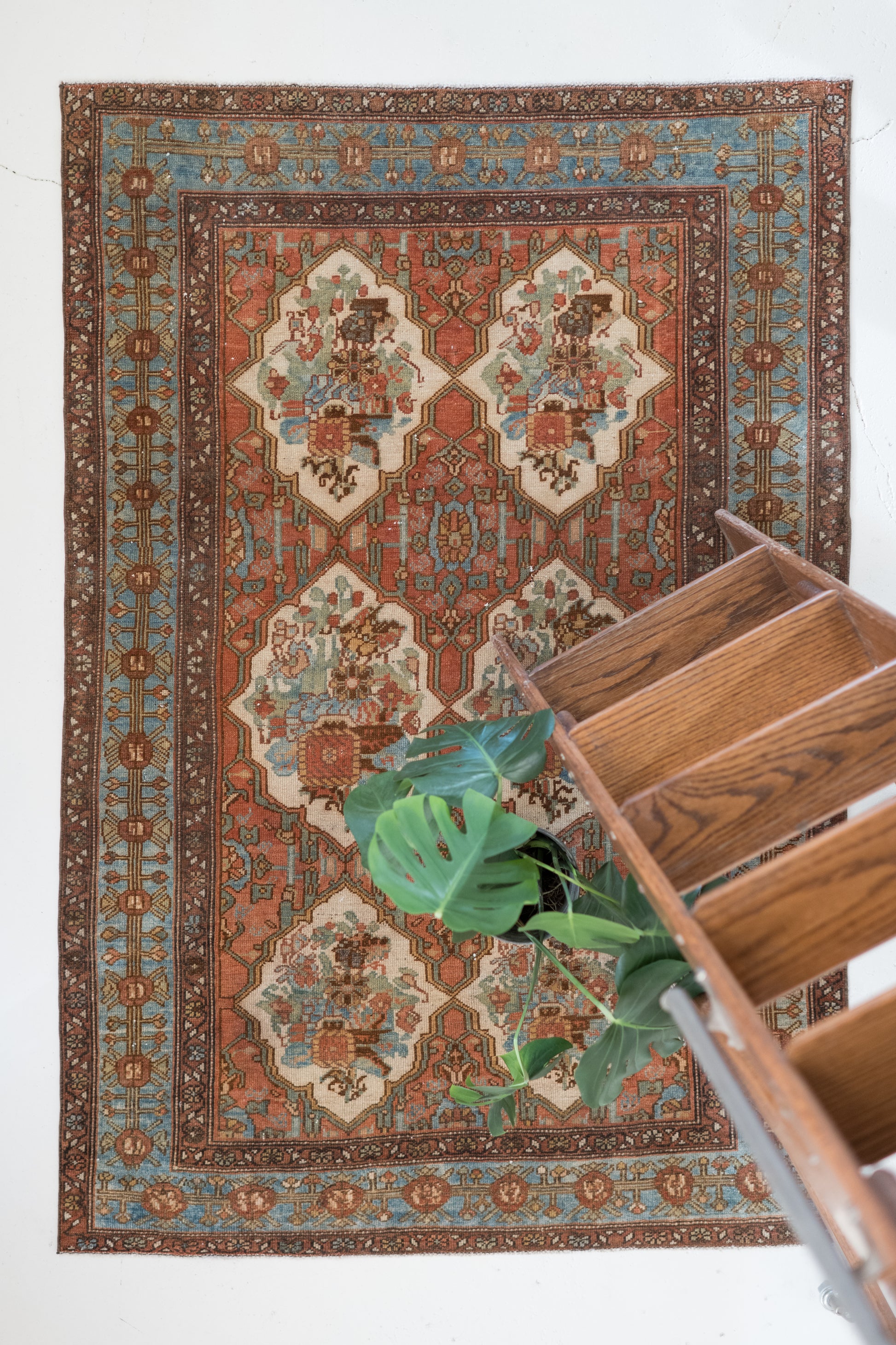 Elevate your space with the rare Bakhtiari pattern and stunning vegetable dyes of our Libby rug. Its French blue border accentuates six beautiful floral medallions, adding a touch of charm and character to any room. Made with wool on a cotton foundation, it boasts a low pile for a cozy and durable feel.