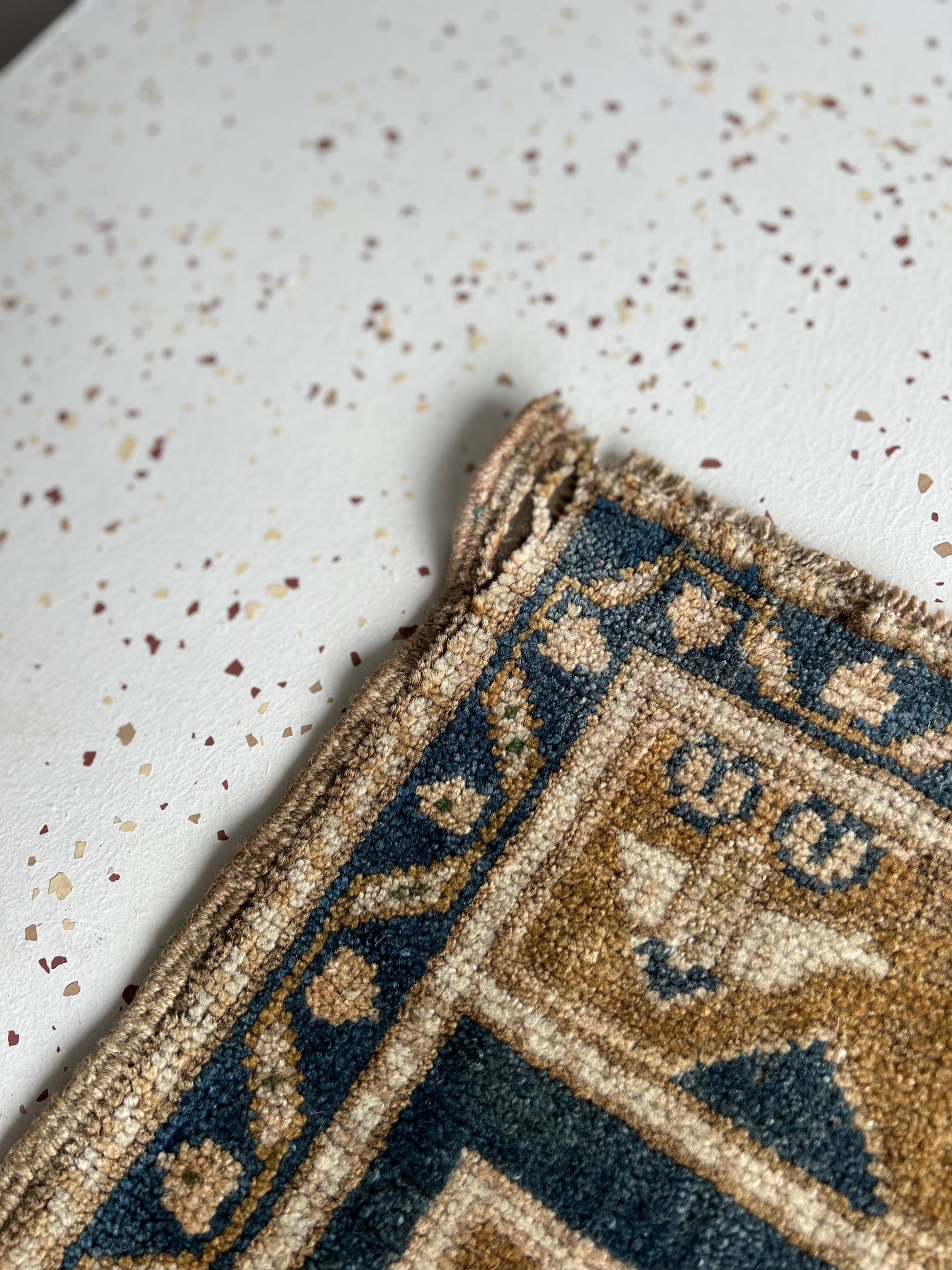 Cleaning: Vacuum on occasion, with suction only. Spot clean with clear soap, a little bit of white vinegar, and water. Never use a carpet cleaner machine to clean a vintage rug. If your piece is fragile or antique, or needs a deep clean, take it to a professional.