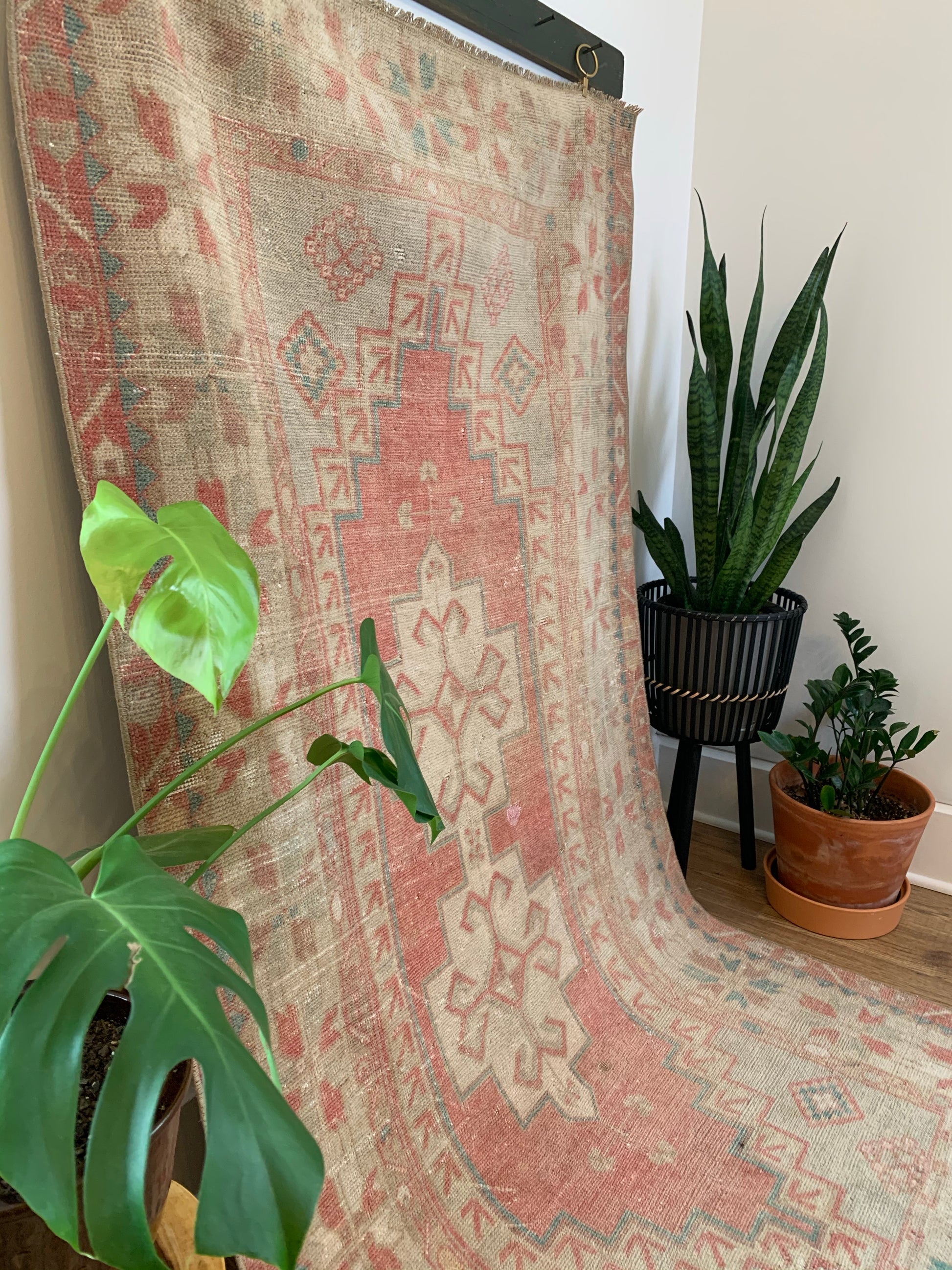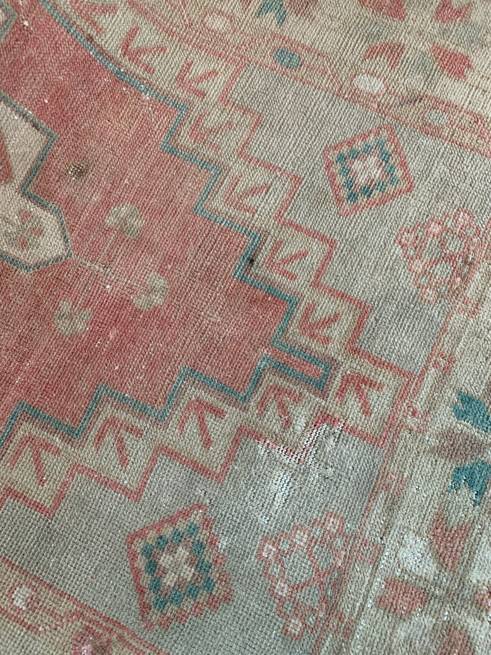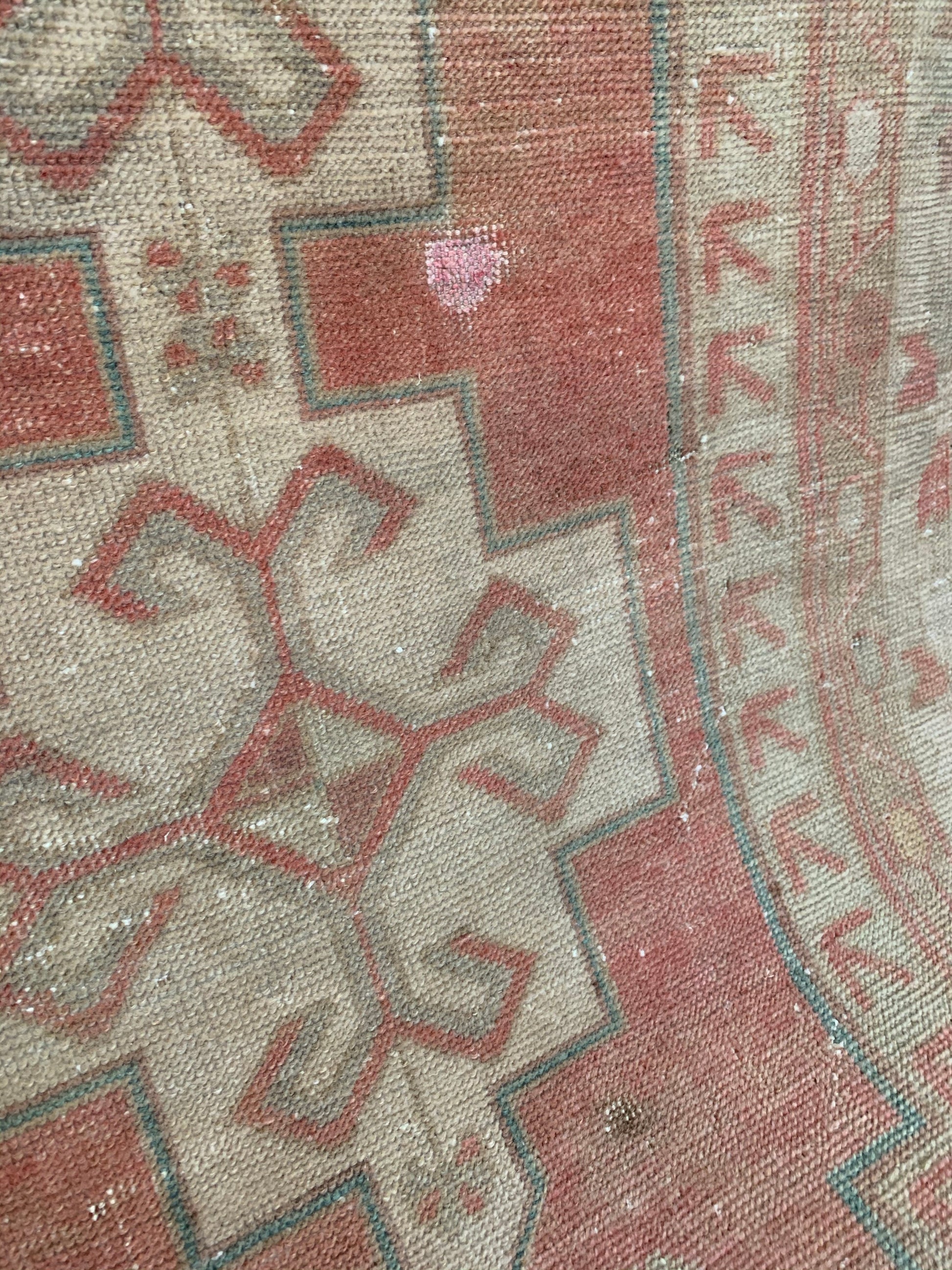 Cleaning: Vacuum on occasion, with suction only. Spot clean with clear soap, a little bit of white vinegar, and water. Never use a carpet cleaner machine to clean a vintage rug. If your piece is fragile or antique, or needs a deep clean, take it to a professional.