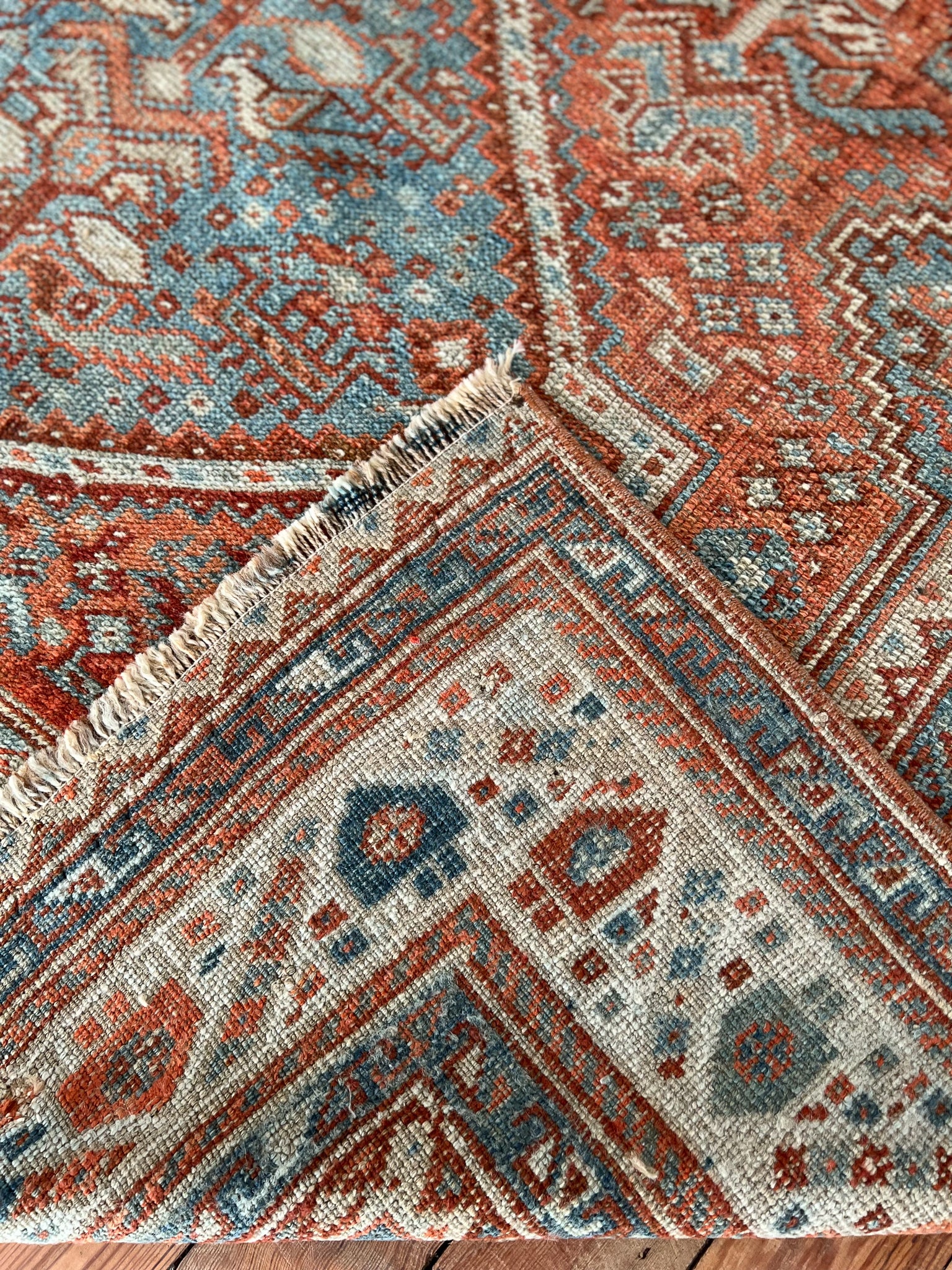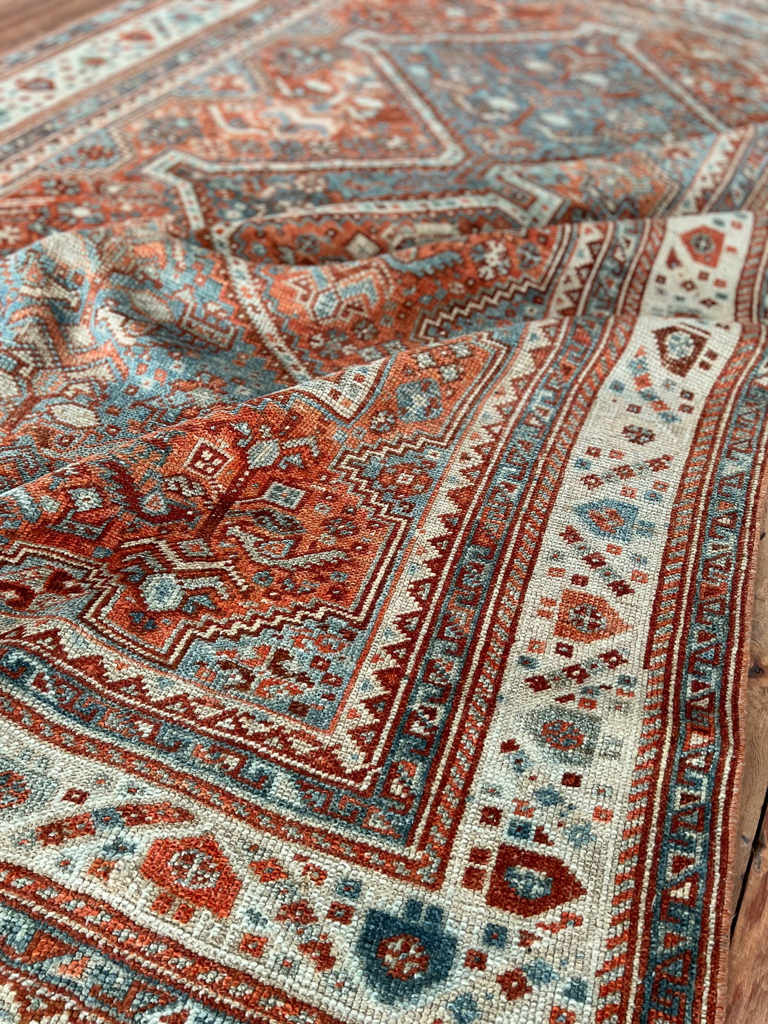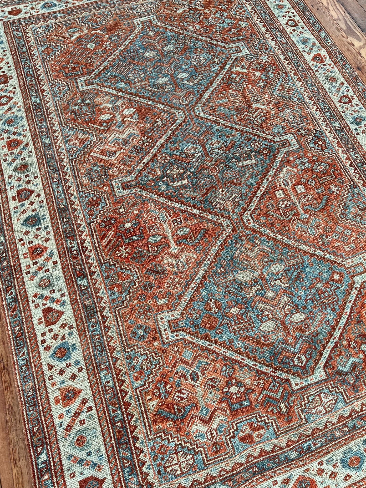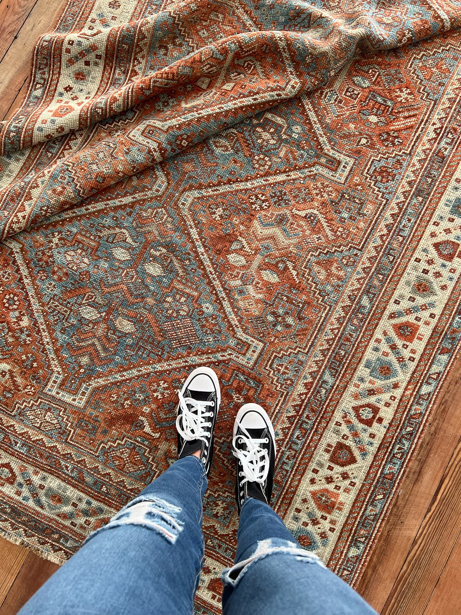 All rugs have been thoroughly cleaned; age-related wear and patina are considered normal in these unique, hand-woven vintage rugs. All pieces have been photographed with moderate natural light. In some cases, photos are edited to depict the most true-to-life colors. Colors may vary depending on your phone or screen settings. Some items may not be perfectly straight or rectangle. We consider these characteristics part of what makes them truly one-of-a-kind.