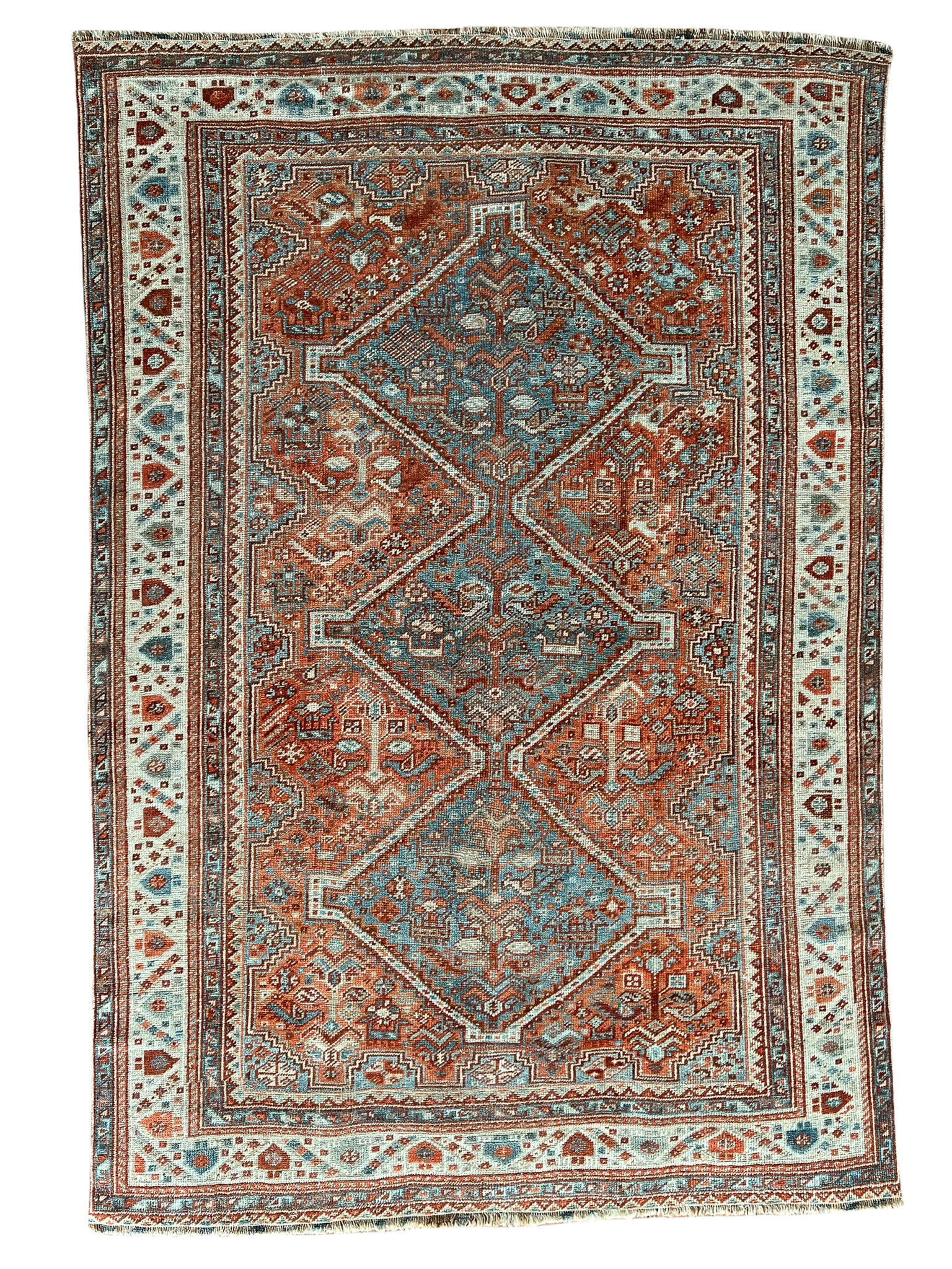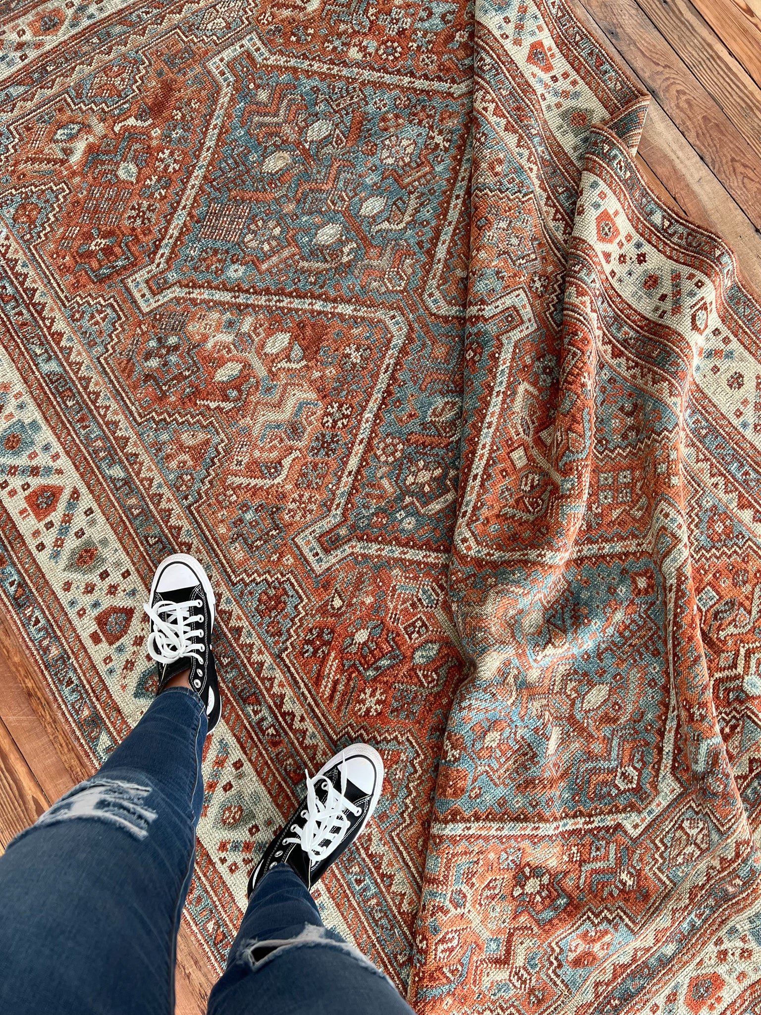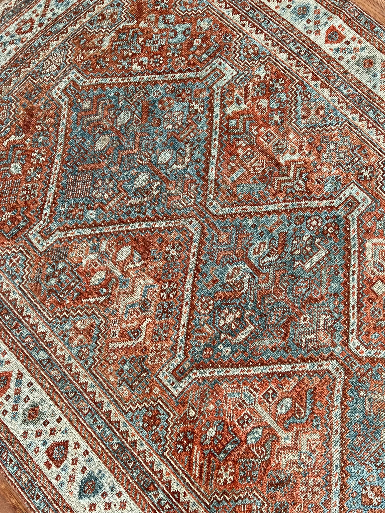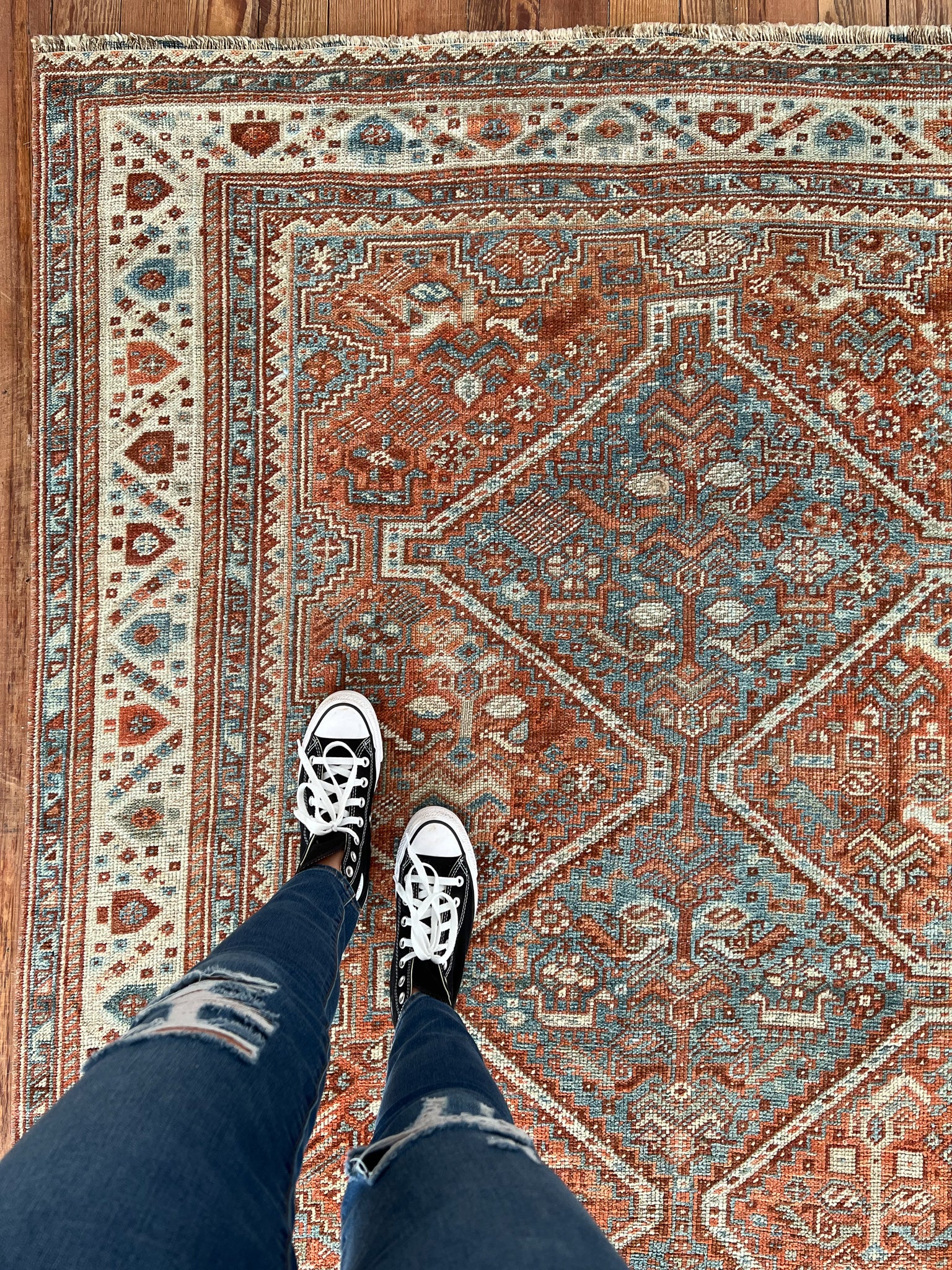 All rugs have been thoroughly cleaned; age-related wear and patina are considered normal in these unique, hand-woven vintage rugs. All pieces have been photographed with moderate natural light. In some cases, photos are edited to depict the most true-to-life colors. Colors may vary depending on your phone or screen settings. Some items may not be perfectly straight or rectangle. We consider these characteristics part of what makes them truly one-of-a-kind.