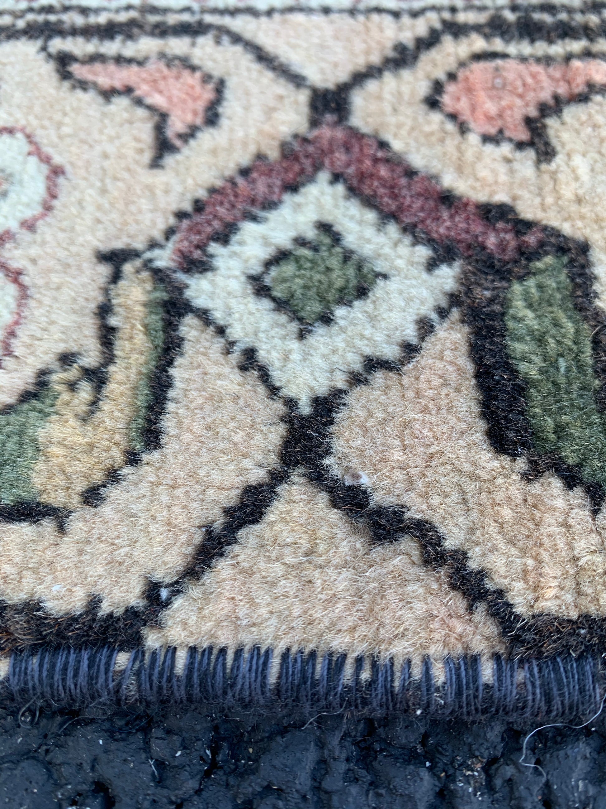 Cleaning: Vacuum on occasion, with suction only. Spot clean with clear soap, a little bit of white vinegar, and water. Never use a carpet cleaner machine to clean a vintage rug. If your piece is fragile or antique, or needs a deep clean, take it to a professional.