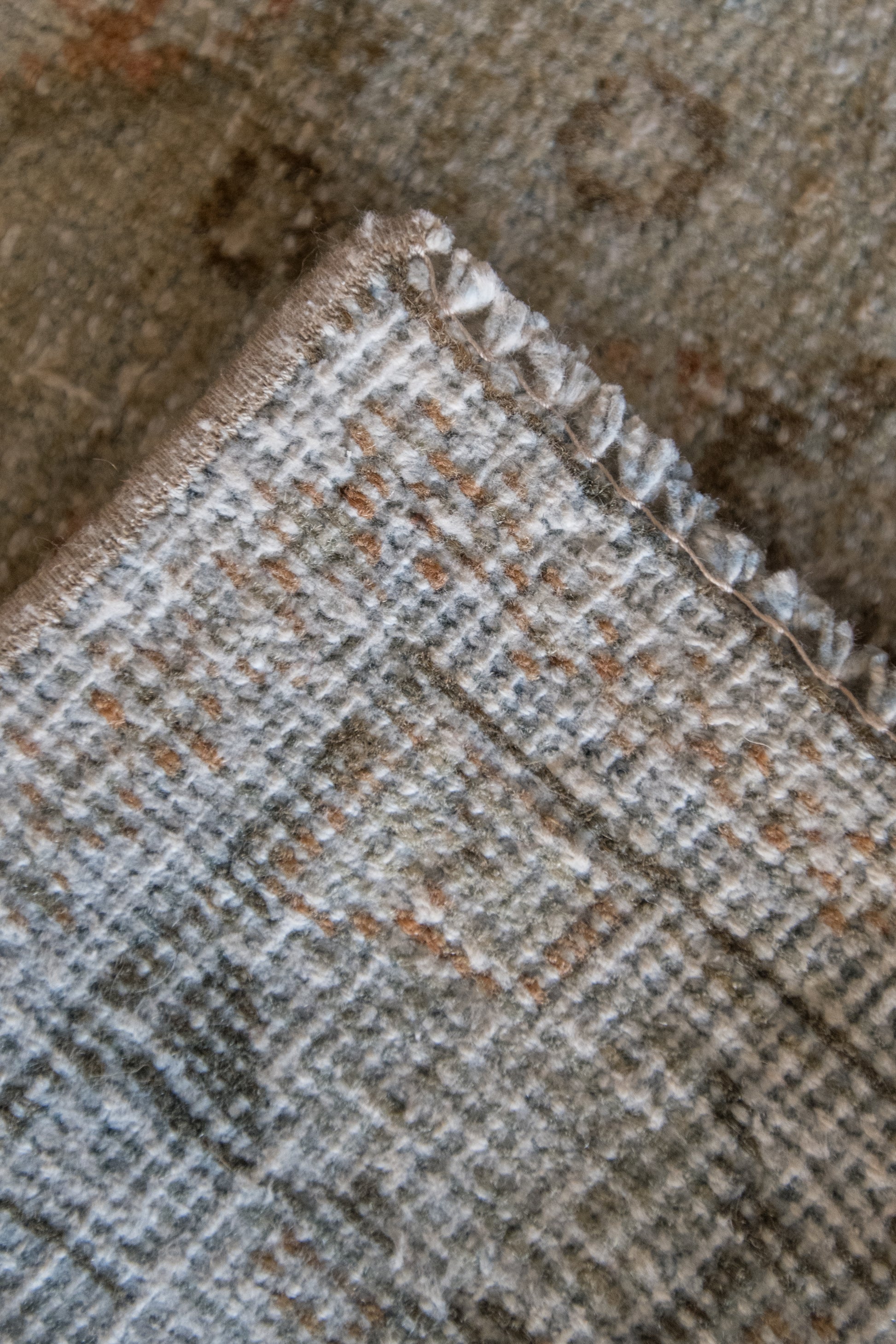 Each rug listed on our site is either a wool pile on a cotton foundation or a wool pile on a wool foundation. Quality, unrefined wool contains a substance called lanolin. Lanolin tends to have a natural smell, which many compare to the smell of sheep – or almost metallic-y, but sweet and grassy.