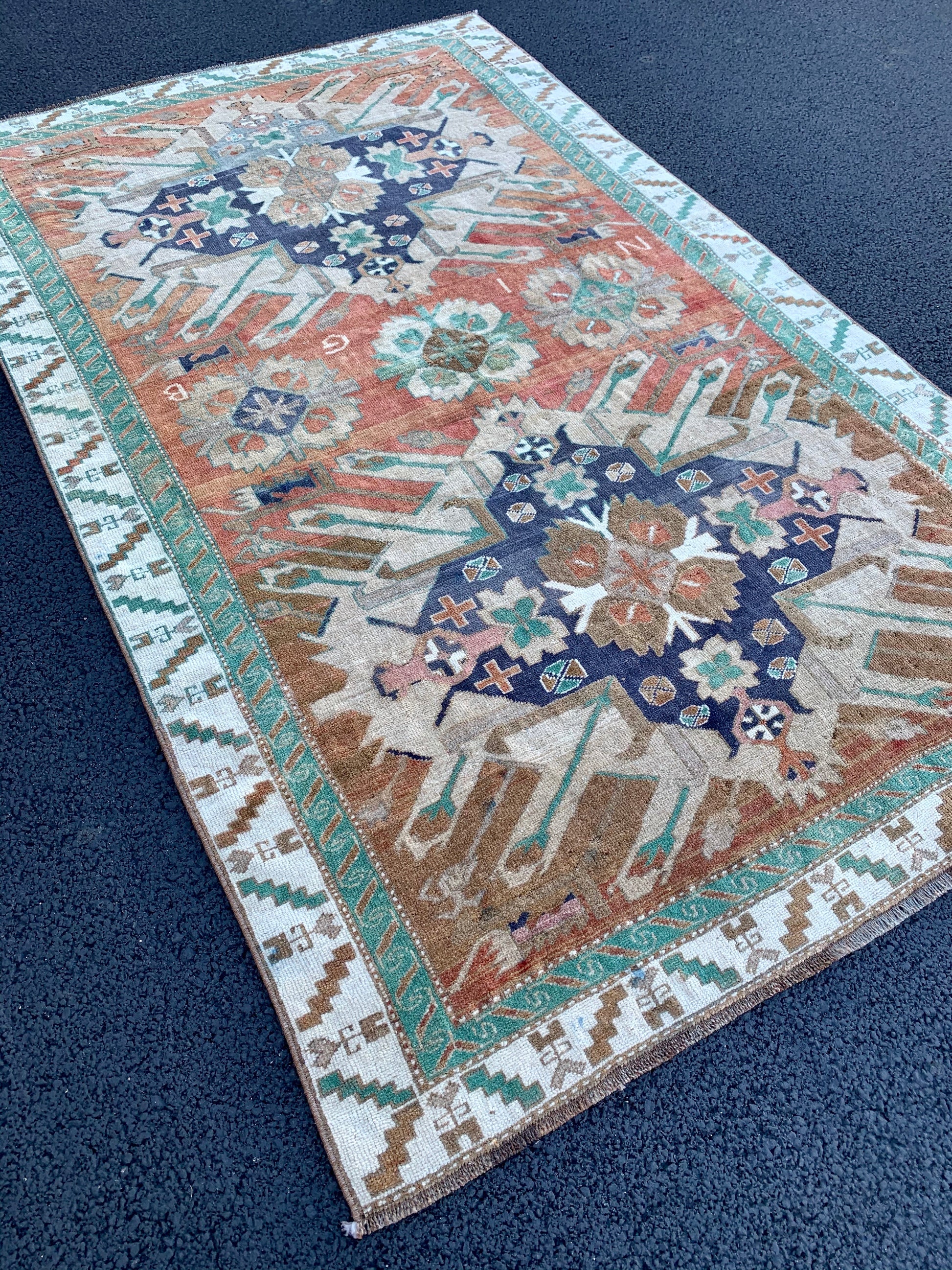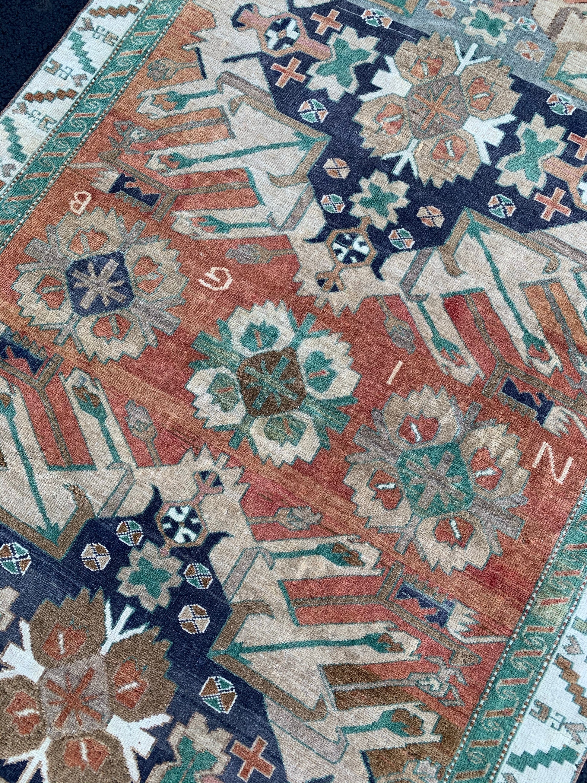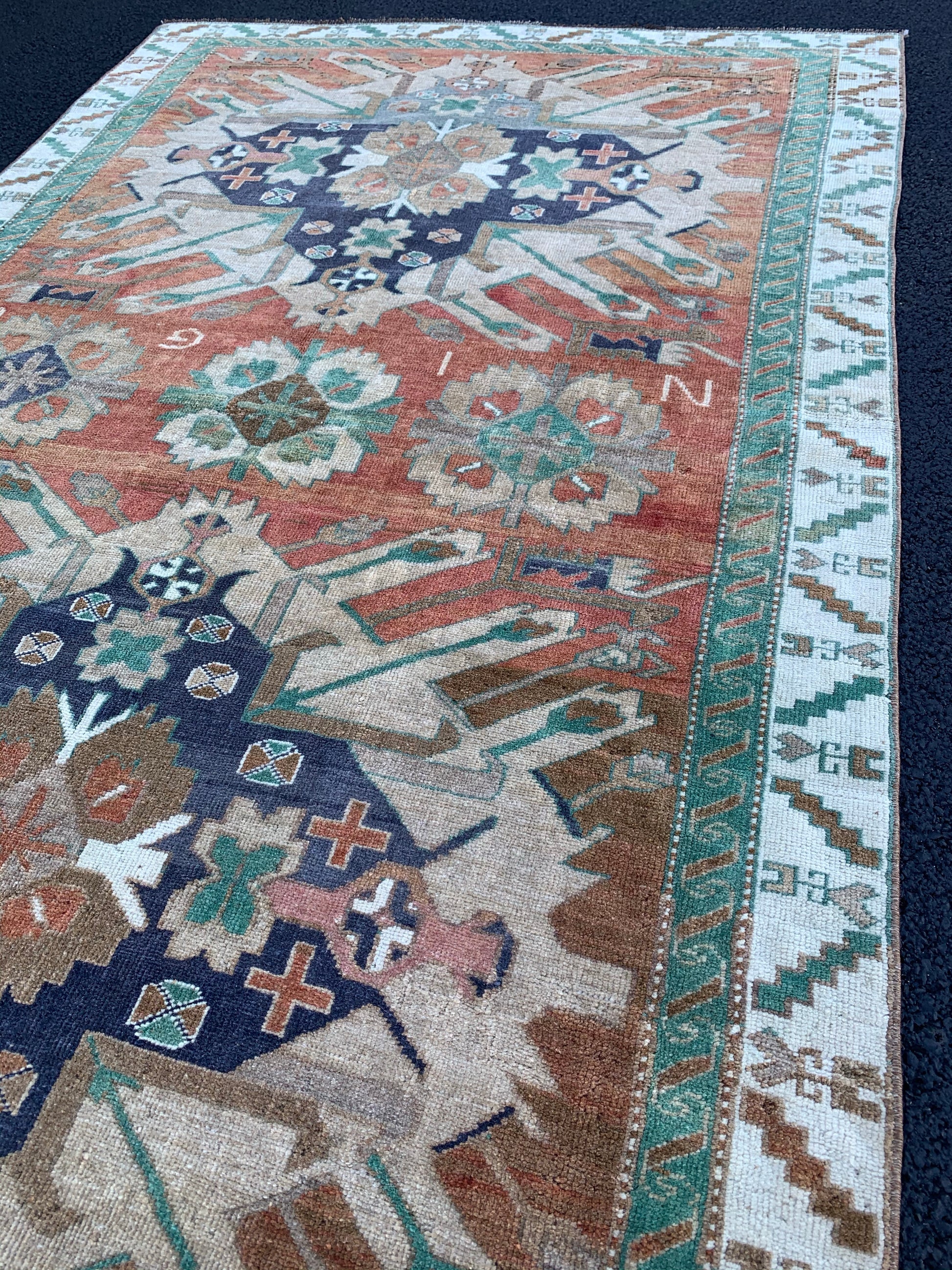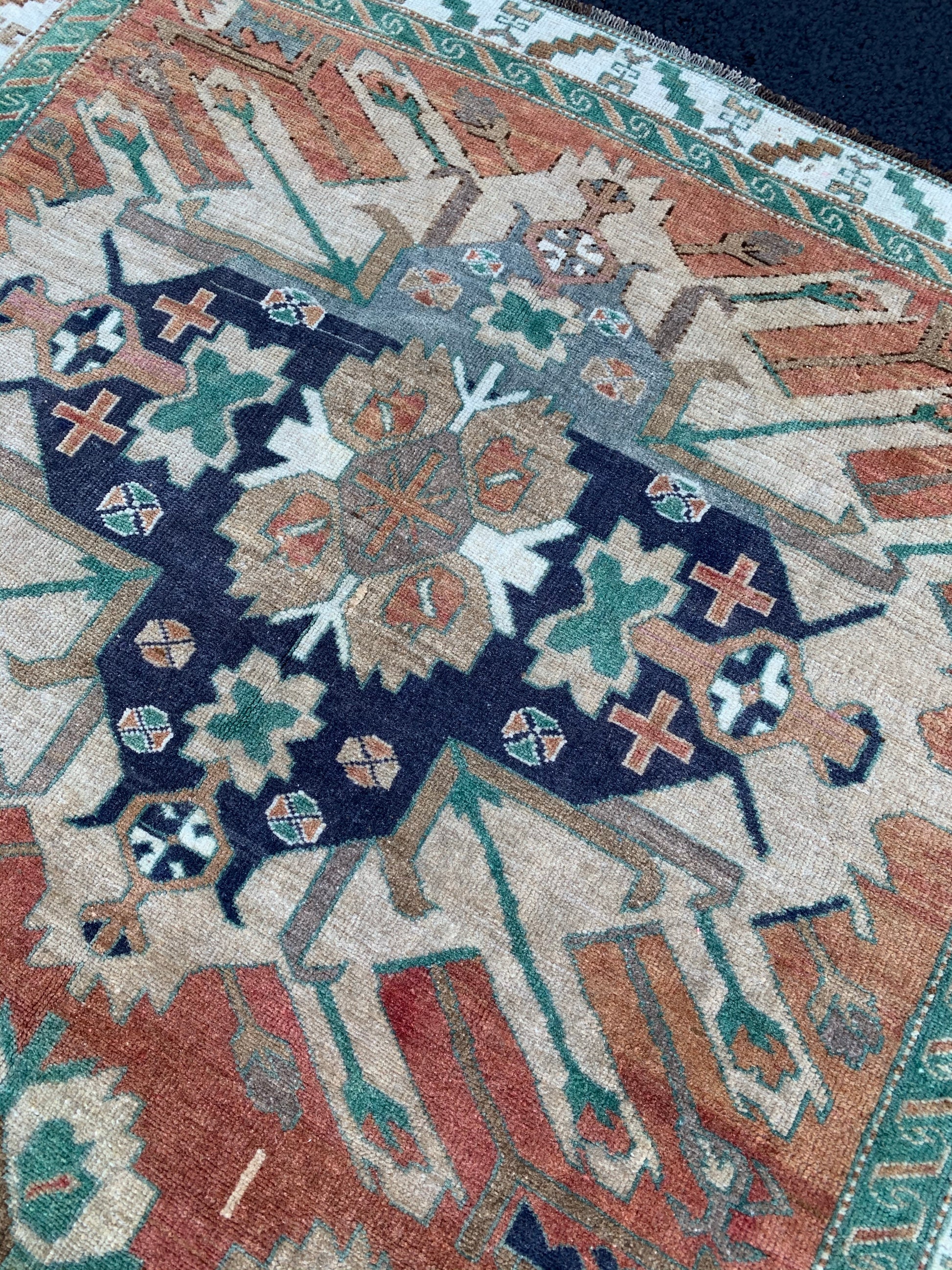 All rugs have been thoroughly cleaned; age-related wear and patina are considered normal in these unique, hand woven vintage rugs. All pieces have been photographed with moderate natural light. Colors may vary depending on your phone or screen settings. Some items may not be perfectly straight or rectangle. We consider these characteristics part of what makes them truly one-of-a-kind.