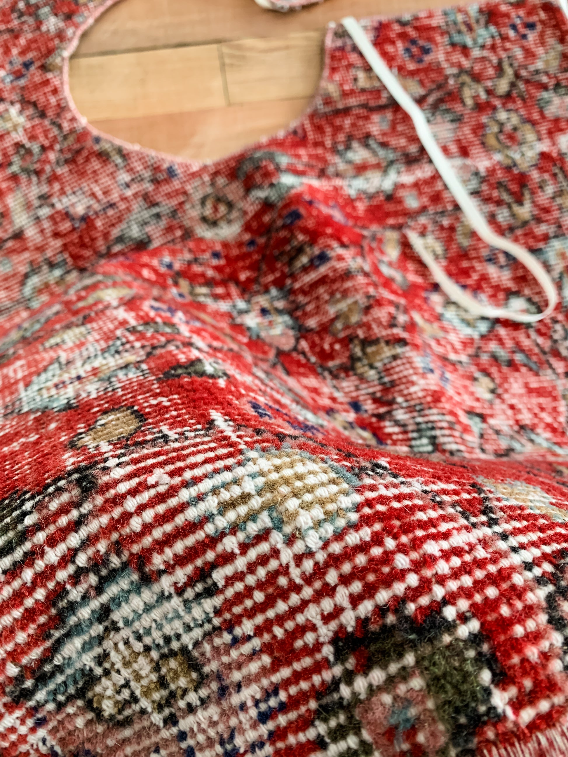 Cleaning: Vacuum on occasion, with suction only. Spot clean with clear soap, a little bit of white vinegar, and water. Never use a carpet cleaner machine to clean a vintage rug. If your piece is fragile or antique, or needs a deep clean, take it to a professional.