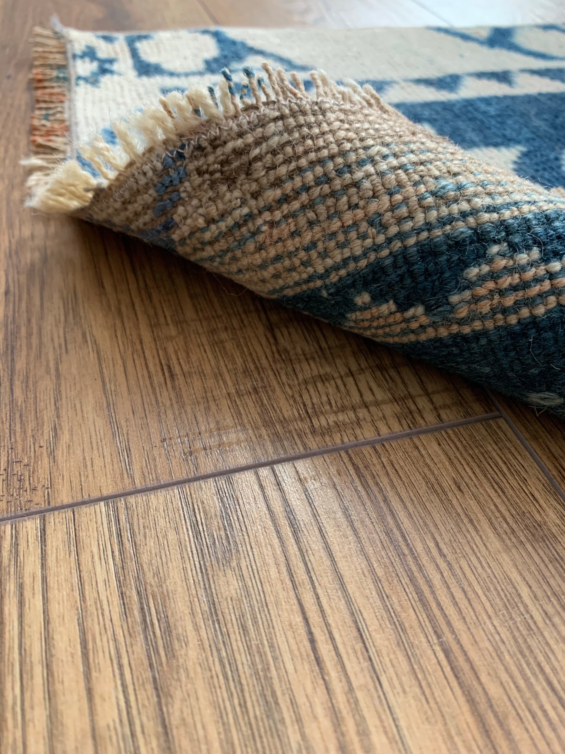Each rug listed on our site is either wool pile on a cotton foundation, or wool pile on a wool foundation. Quality, unrefined wool contains a substance called lanolin. Lanolin tends to have a natural smell, which many compare to the smell of sheep – or almost metallic-y, but sweet and grassy.