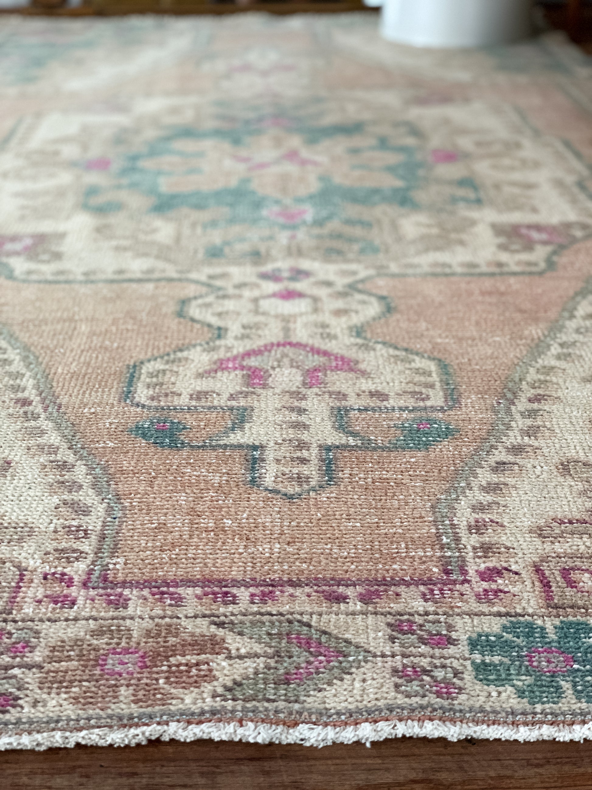 Cleaning: Vacuum on occasion, with suction only. Spot clean with clear soap, a little bit of white vinegar, and water. Never use a carpet cleaner machine to clean a vintage rug. If your piece is fragile or antique, or needs a deep clean, take it to a professional.