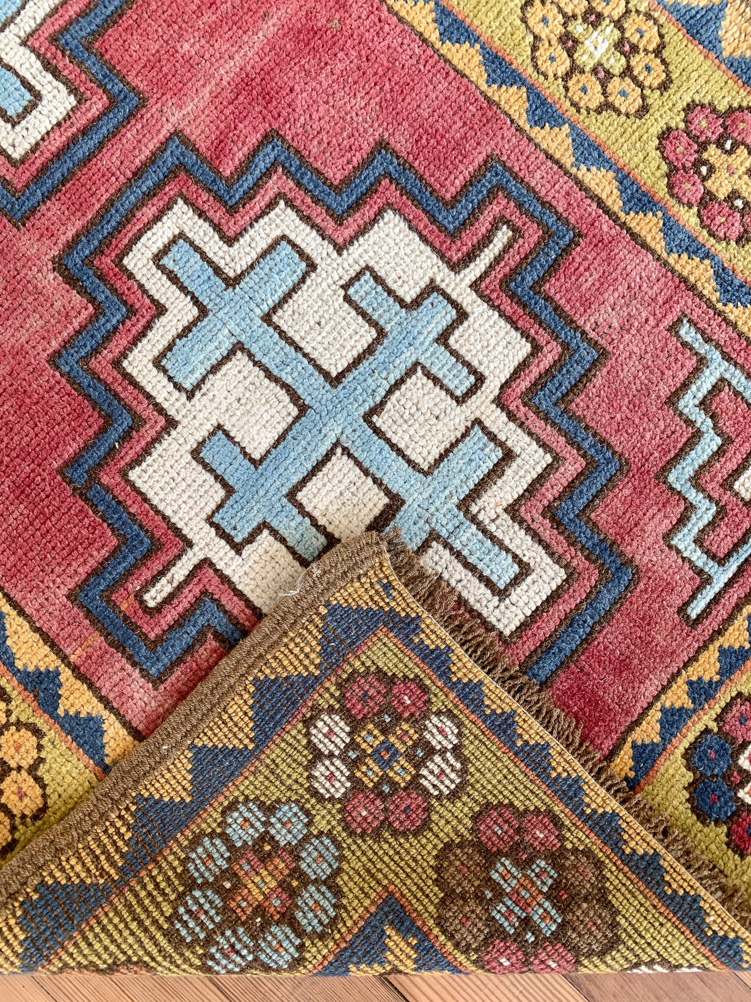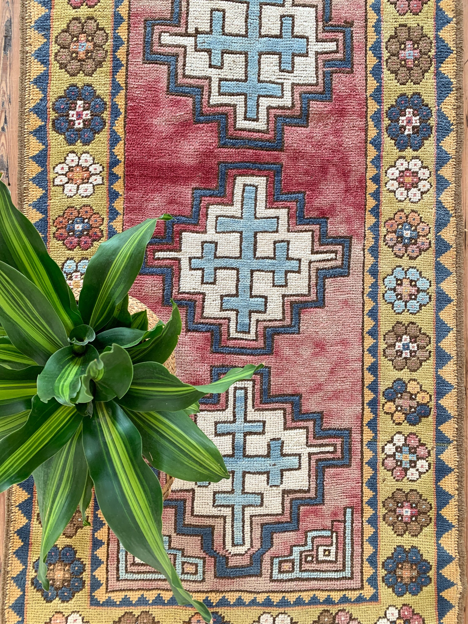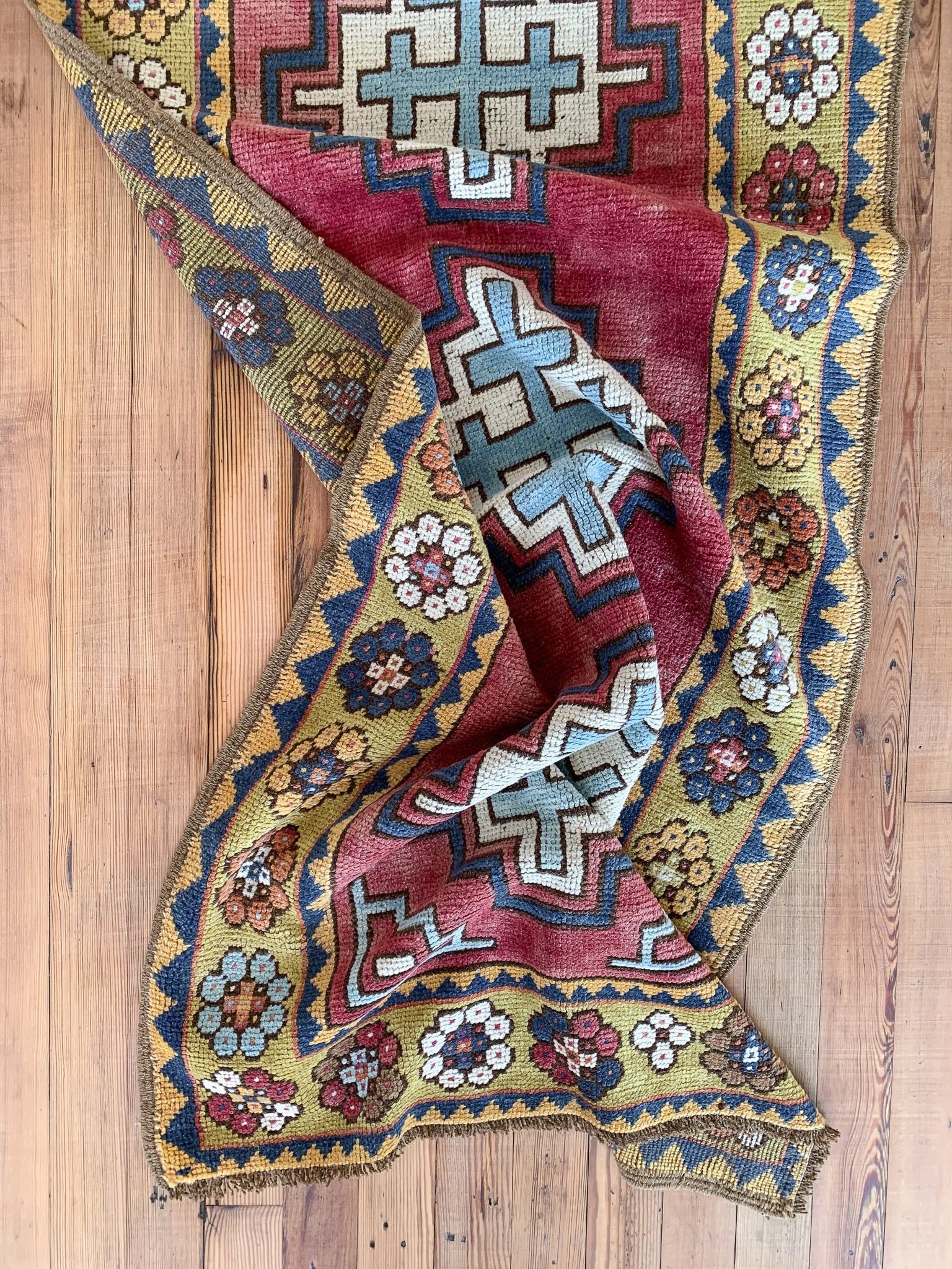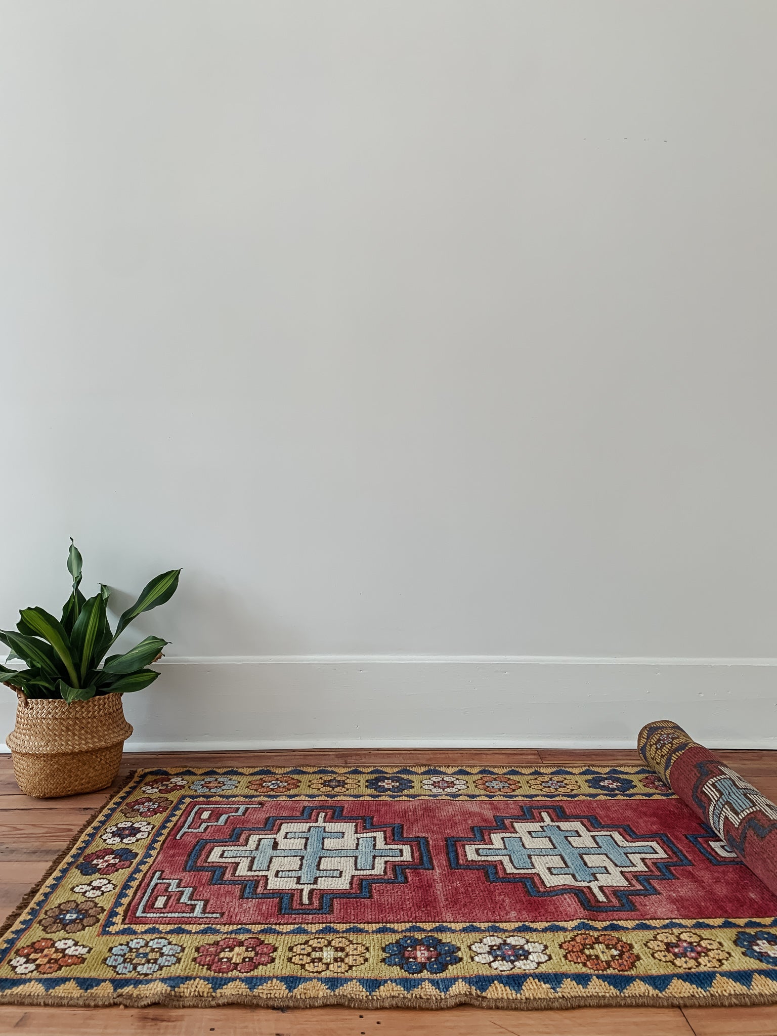 All rugs have been thoroughly cleaned; age-related wear and patina are considered normal in these unique, hand woven vintage rugs. All pieces have been photographed with moderate natural light. In some cases, photos are edited to depict the most true to life colors.Colors may vary depending on your phone or screen settings. Some items may not be perfectly straight or rectangle. We consider these characteristics part of what makes them truly one-of-a-kind.