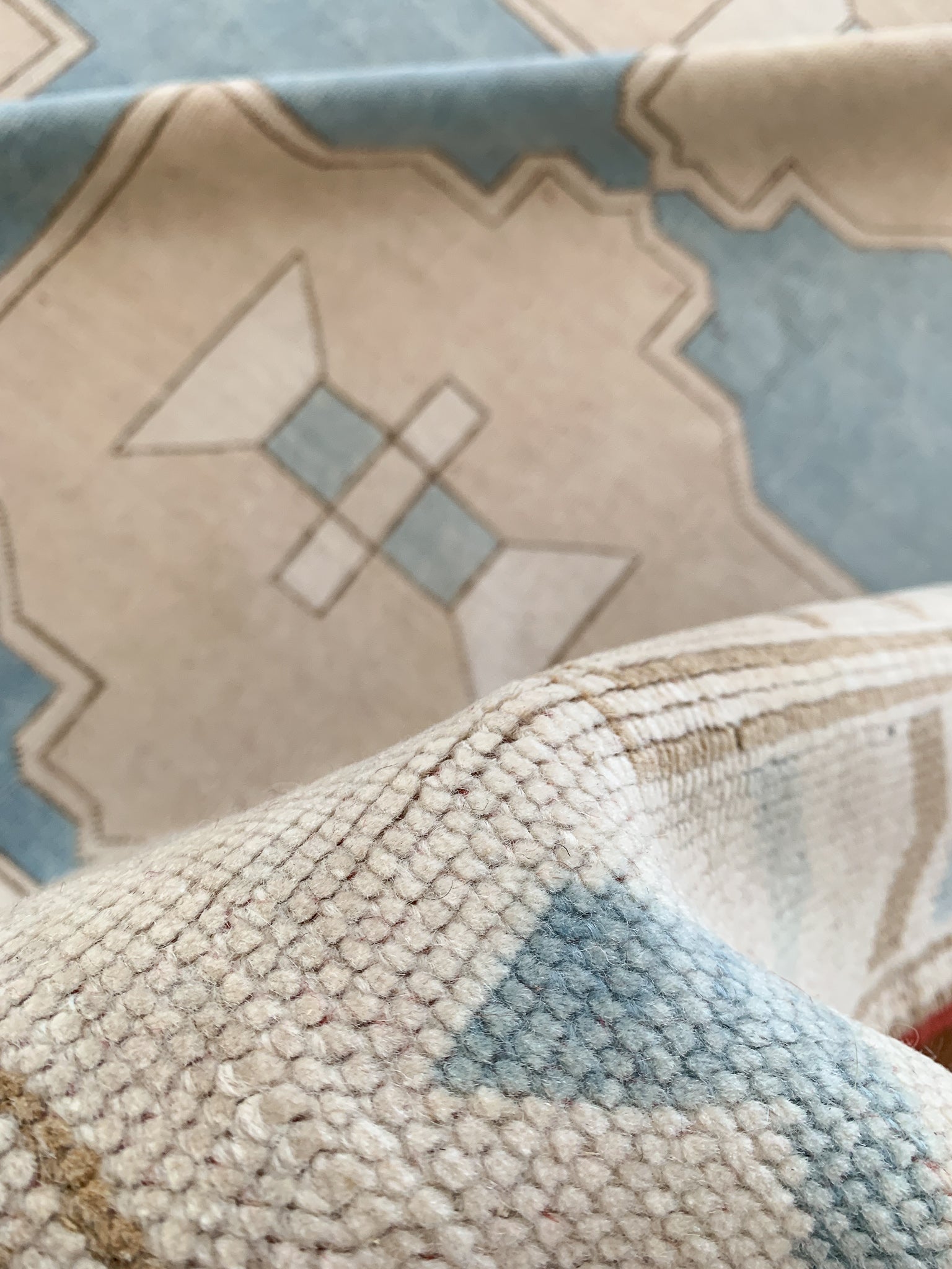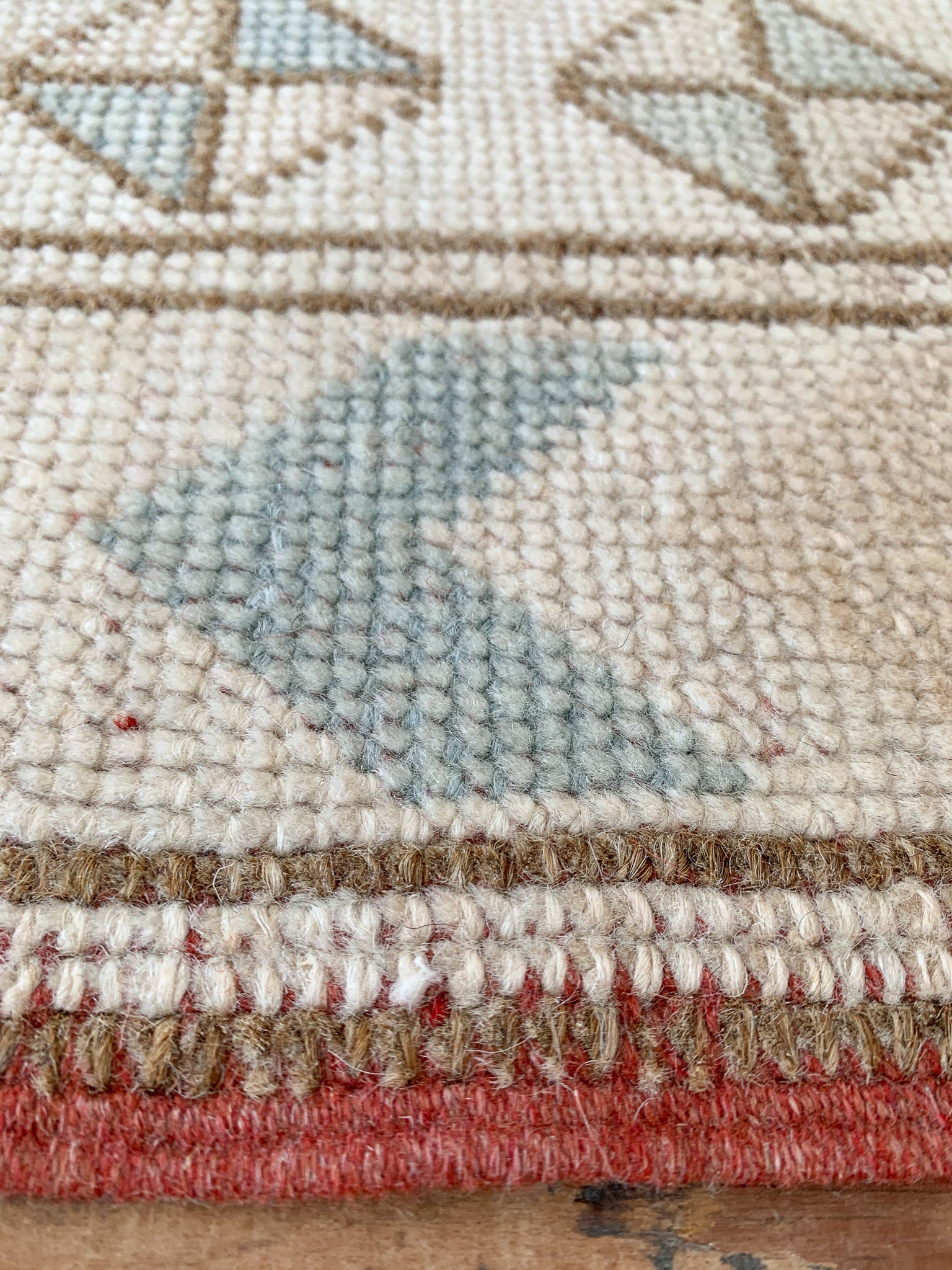 Each rug listed on our site is either wool pile on a cotton foundation, or wool pile on a wool foundation. Quality, unrefined wool contains a substance called lanolin. Lanolin tends to have a natural smell, which many compare to the smell of sheep – or almost metallic-y, but sweet and grassy.