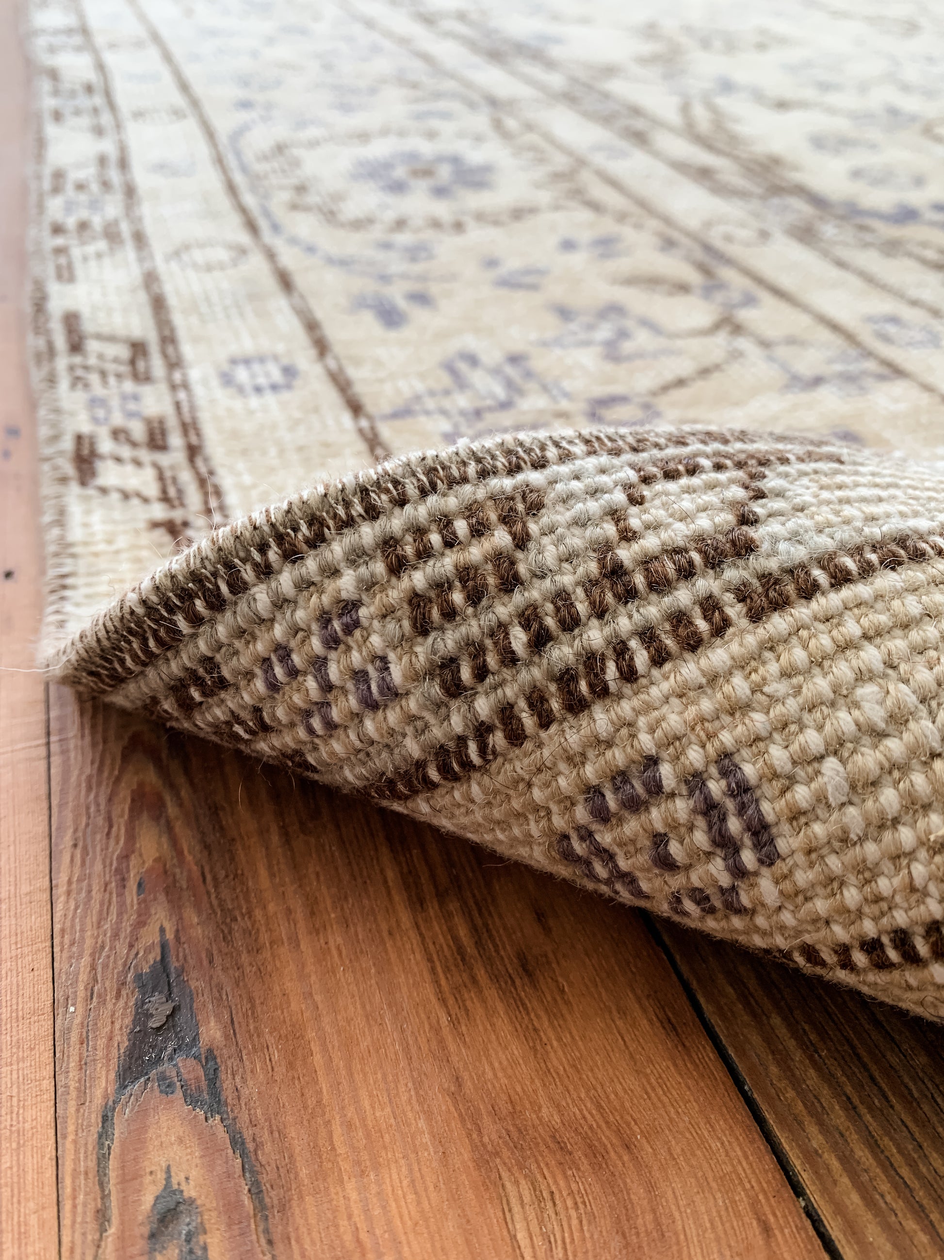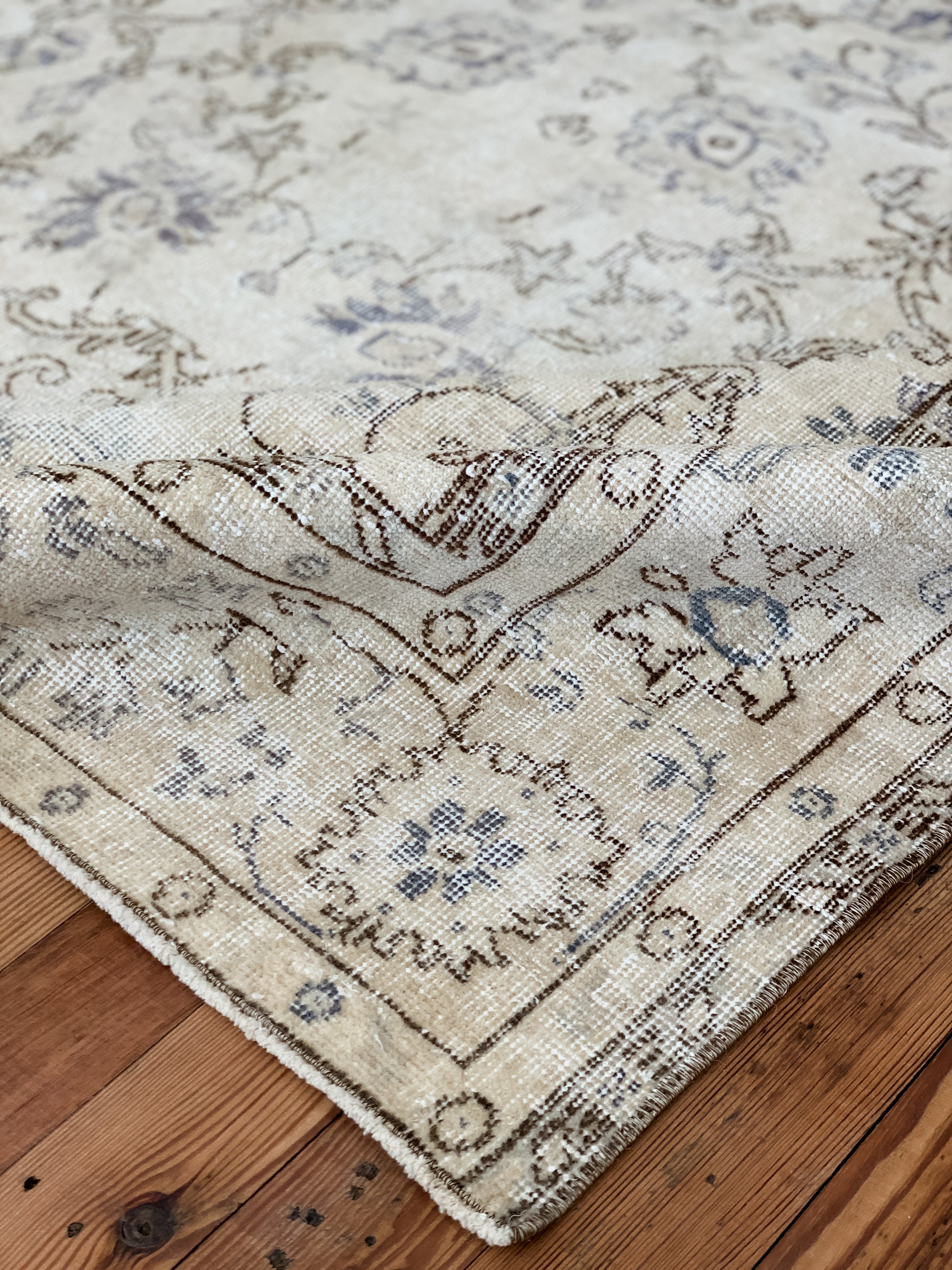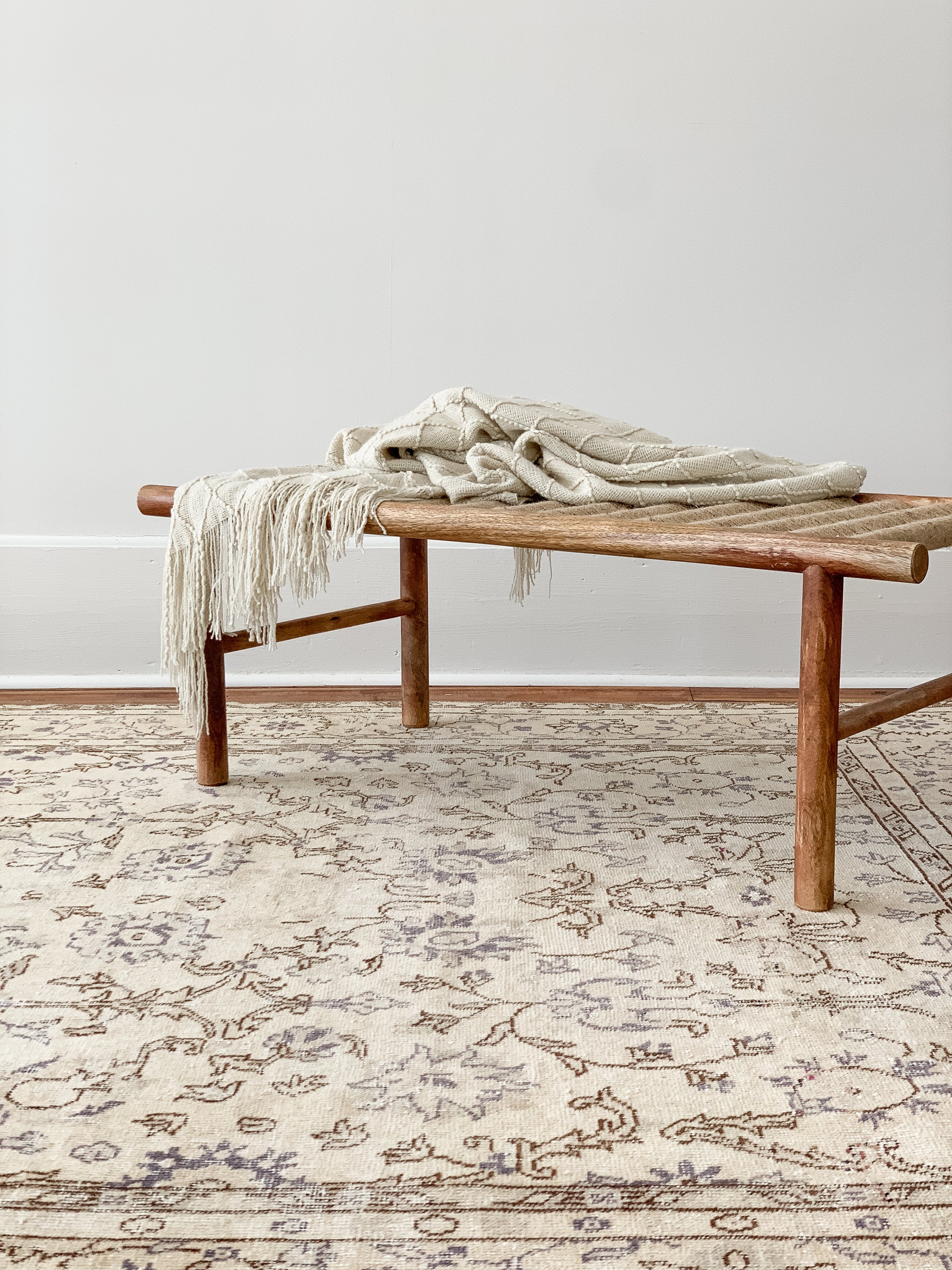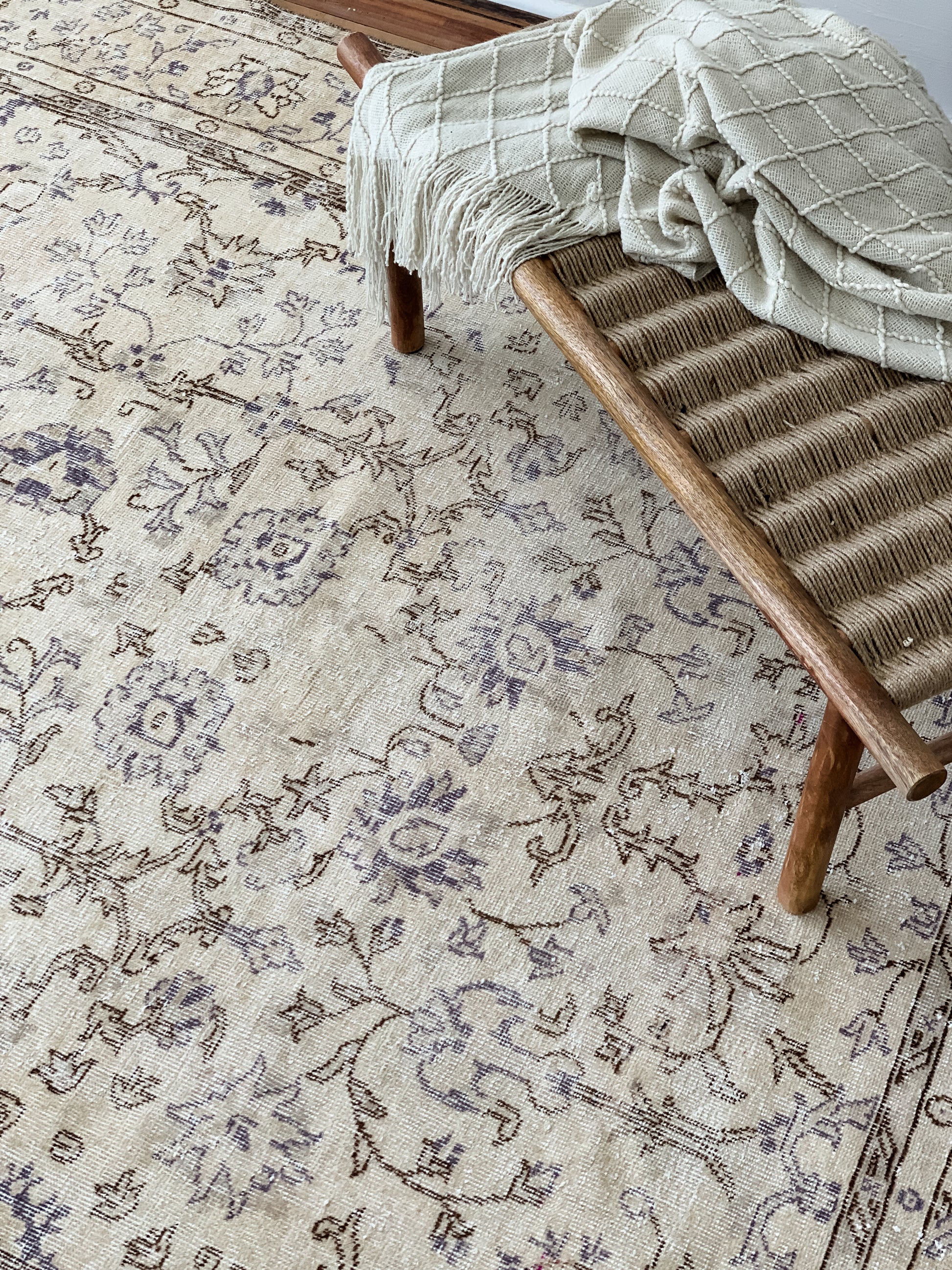 Cleaning: Vacuum on occasion, with suction only. Spot clean with clear soap, a little bit of white vinegar, and water. Never use a carpet cleaner machine to clean a vintage rug. If your piece is fragile or antique, or needs a deep clean, take it to a professional.
