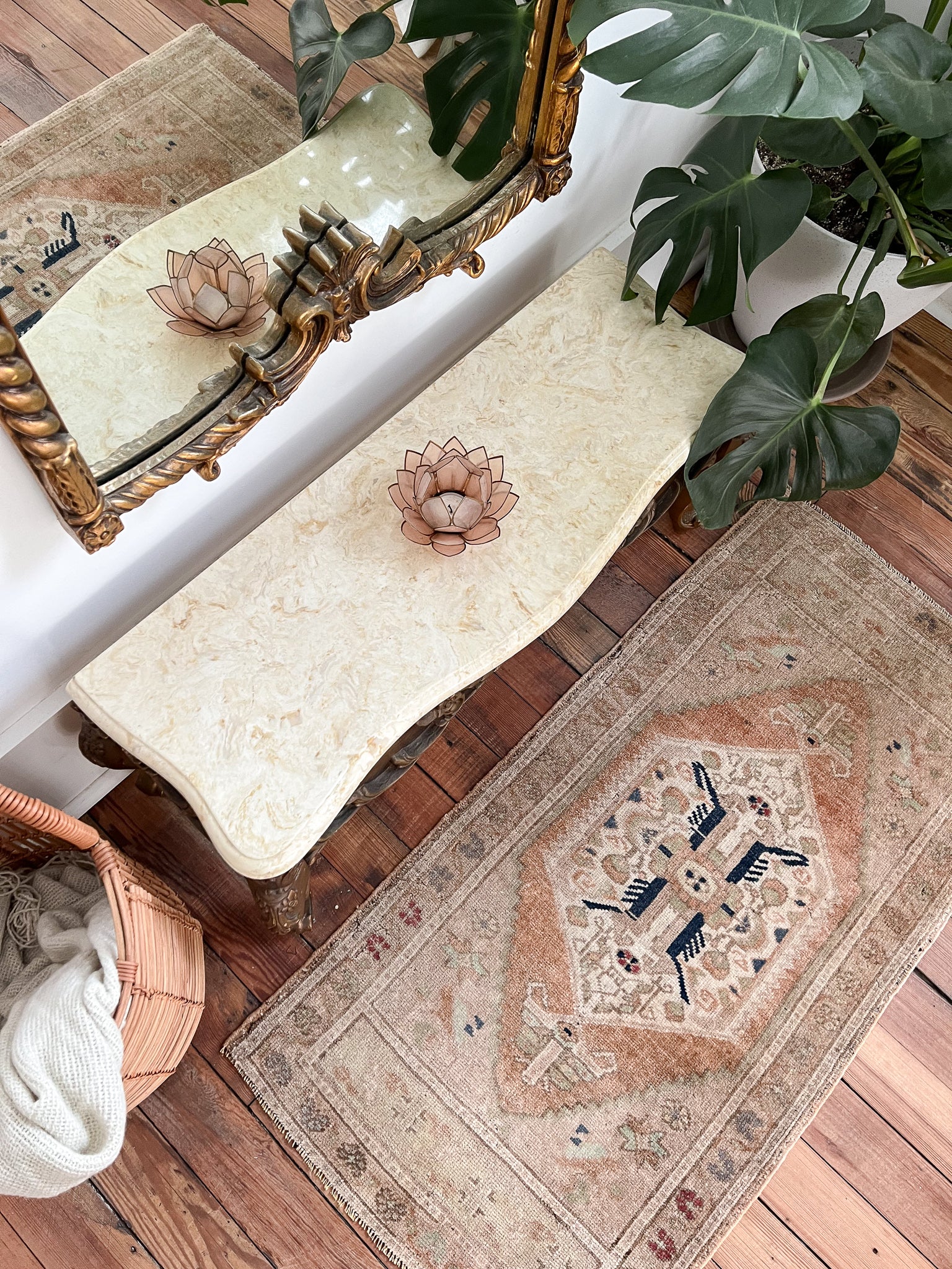 All rugs have been thoroughly cleaned; age-related wear and patina are considered normal in these unique, handwoven vintage rugs. All pieces have been photographed with moderate natural light. In some cases, photos are edited to depict the truest to life colors. Colors may vary depending on your phone or screen settings. Some items may not be perfectly straight or rectangle. We consider these characteristics part of what makes them truly one-of-a-kind.