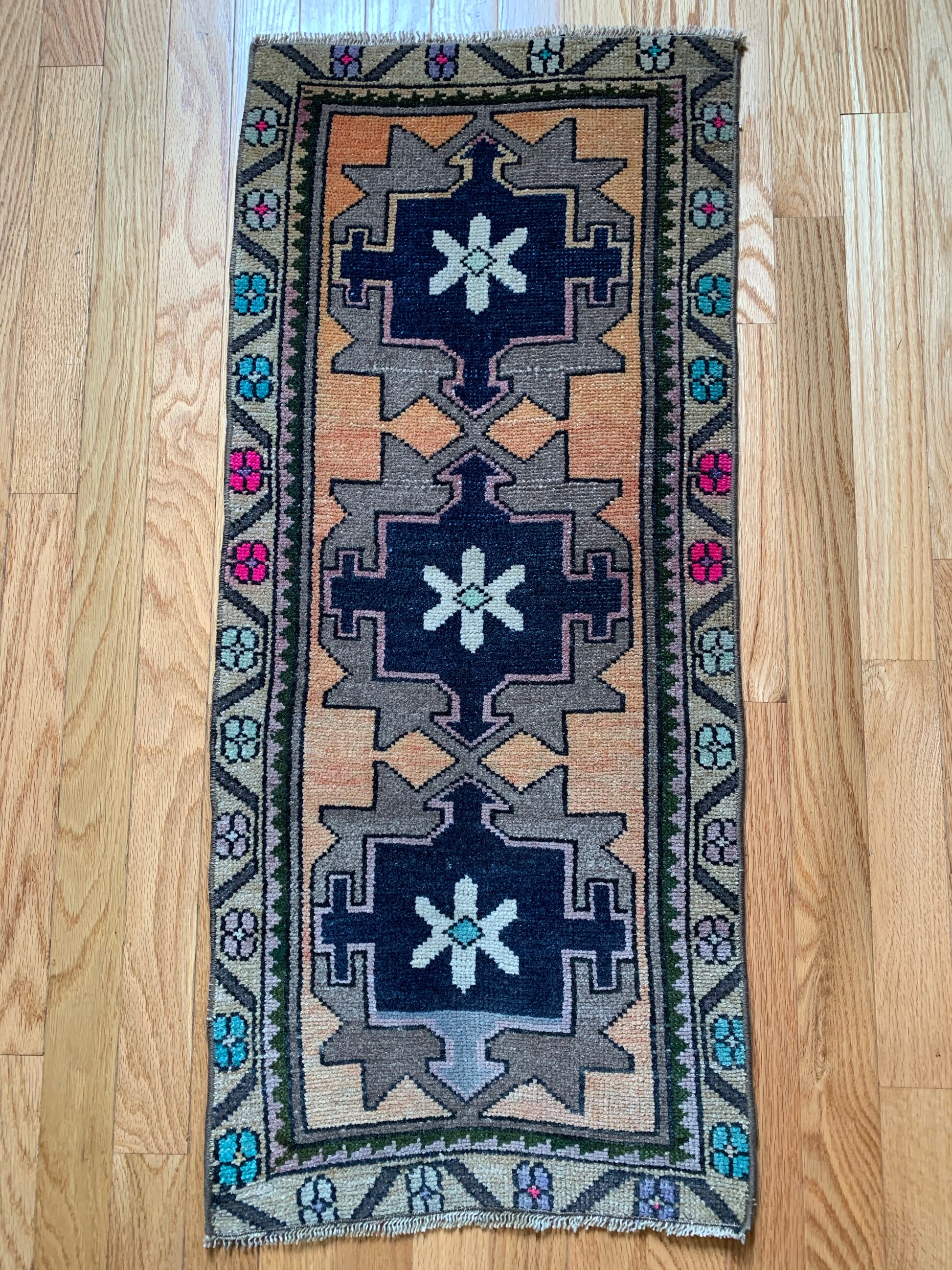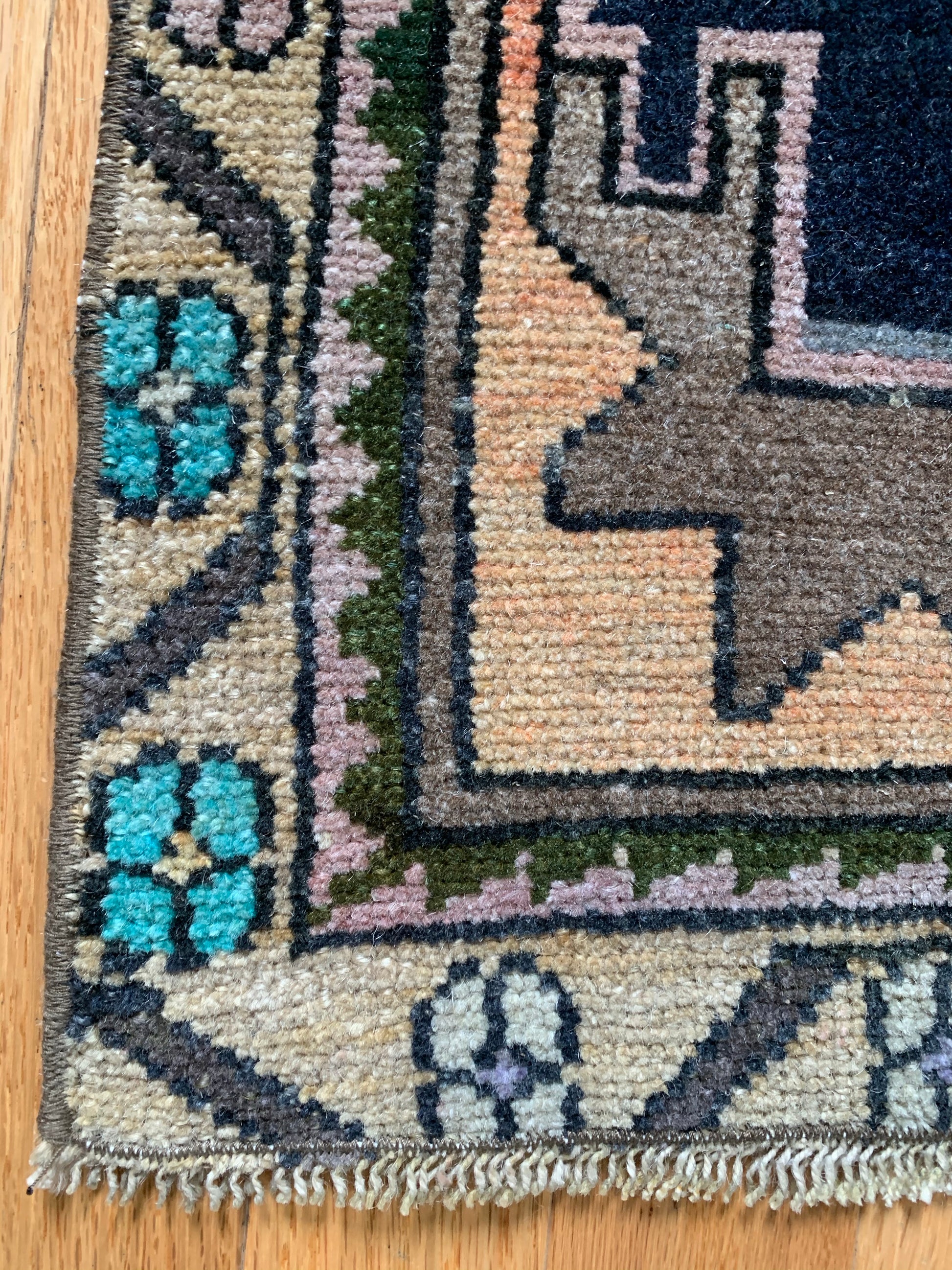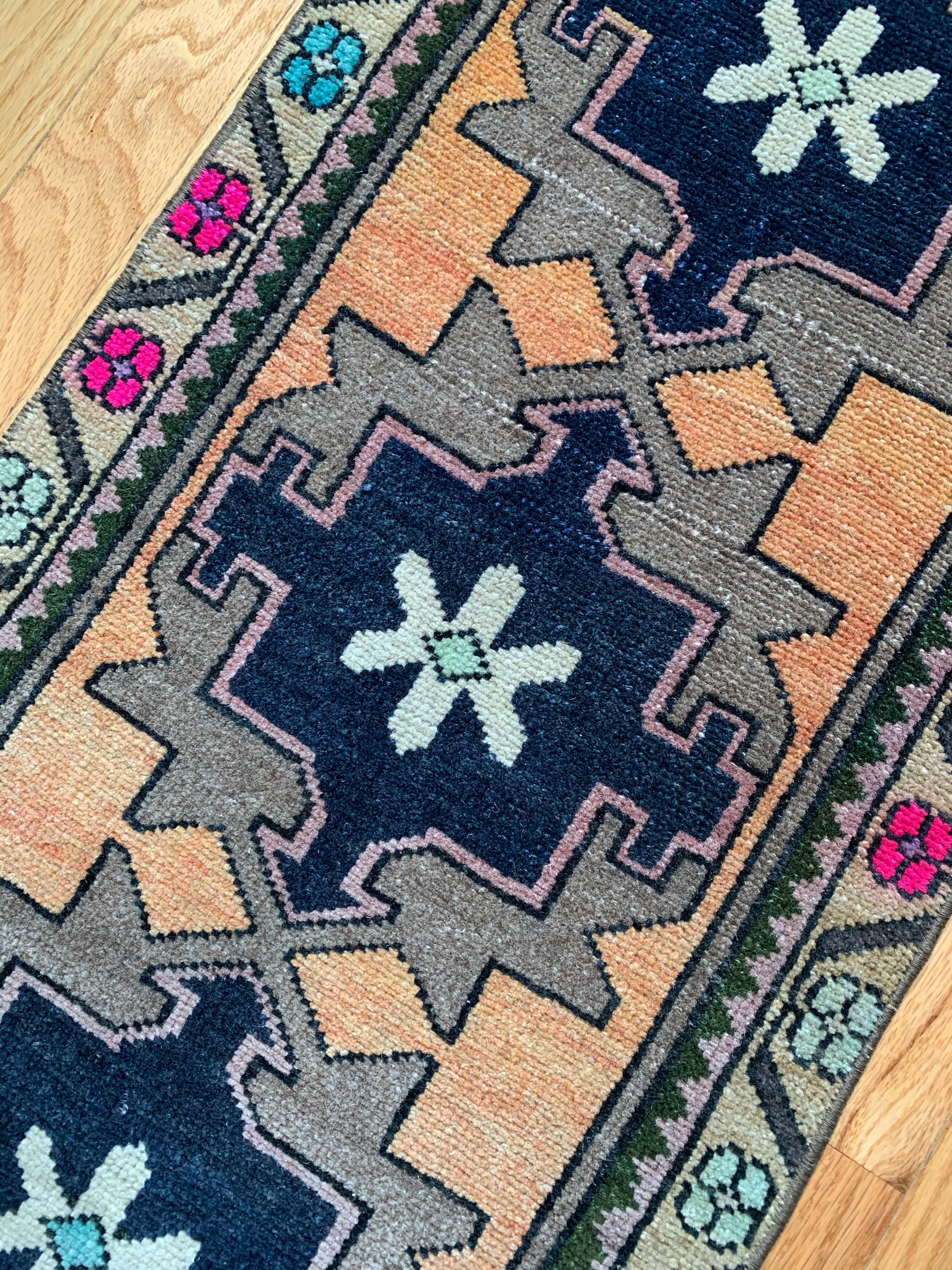 All rugs have been thoroughly cleaned; age-related wear and patina are considered normal in these unique, hand woven vintage rugs. All pieces have been photographed with moderate natural light. Colors may vary depending on your phone or screen settings. Some items may not be perfectly straight or rectangle. We consider these characteristics part of what makes them truly one-of-a-kind.