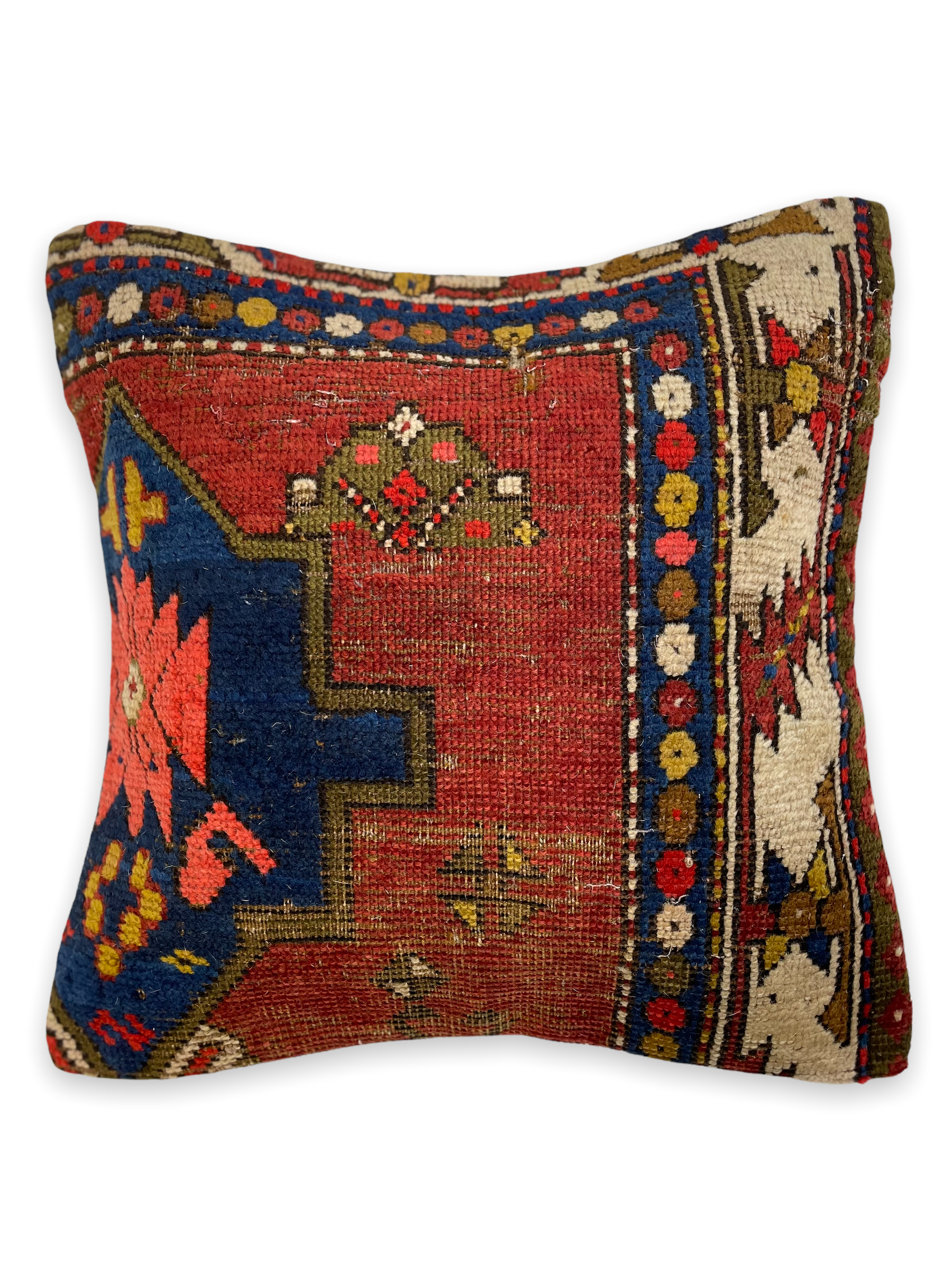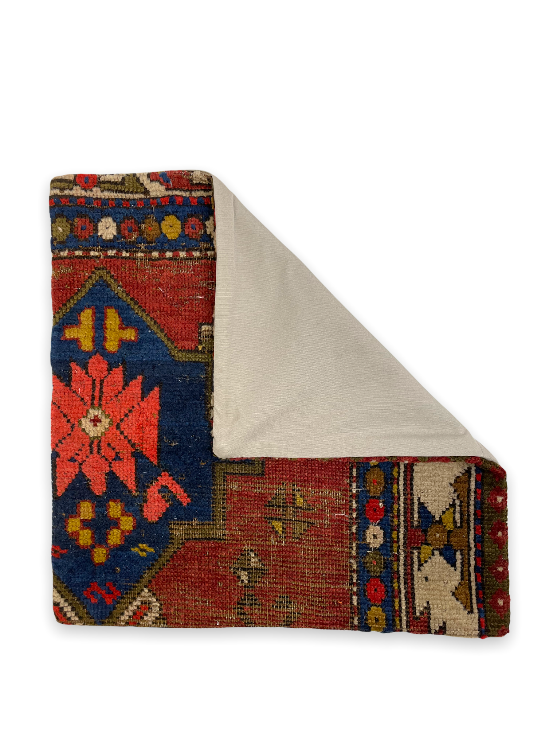Wool rug face with coordinating fabric backing. All sizes are approximate. Age-related wear and patina are considered normal in these unique, hand woven pieces. All items have been photographed with moderate natural light. Colors may vary depending on your phone or screen settings. Some items may not be perfectly straight. We consider these characteristics part of what makes them truly one-of-a-kind.