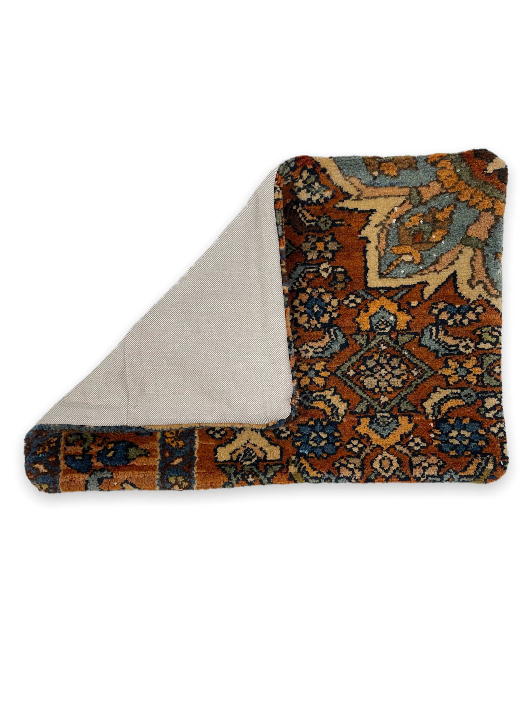 Wool rug face with coordinating fabric backing. All sizes are approximate. Age-related wear and patina are considered normal in these unique, hand woven pieces. All items have been photographed with moderate natural light. Colors may vary depending on your phone or screen settings. Some items may not be perfectly straight. We consider these characteristics part of what makes them truly one-of-a-kind.
