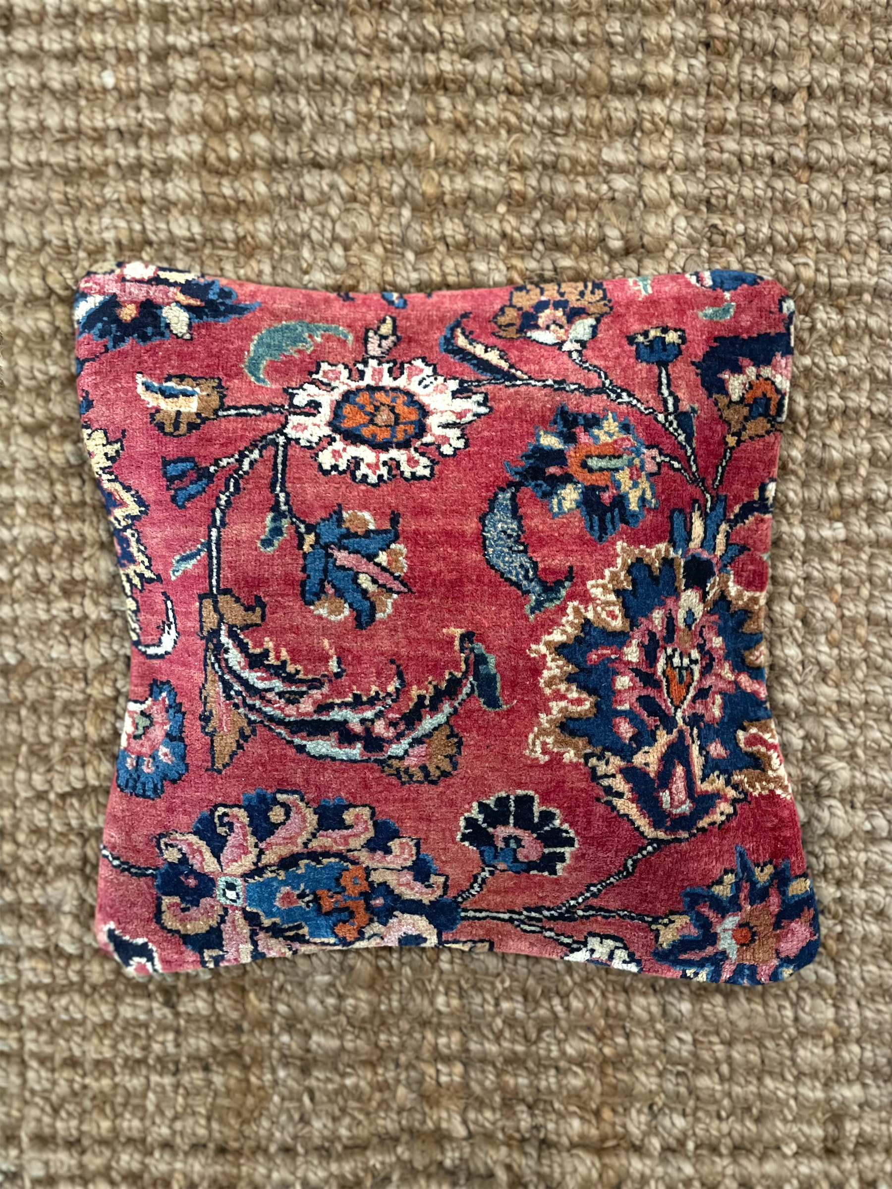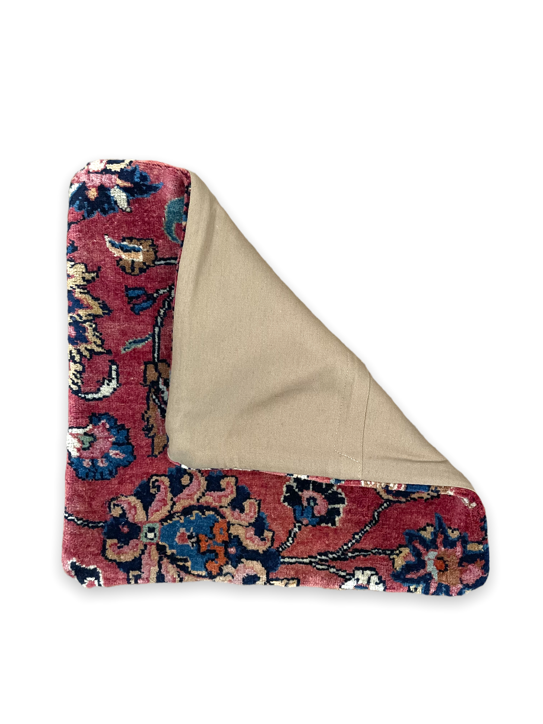 Wool rug face with coordinating fabric backing. All sizes are approximate. Age-related wear and patina are considered normal in these unique, hand woven pieces. All items have been photographed with moderate natural light. Colors may vary depending on your phone or screen settings. Some items may not be perfectly straight. We consider these characteristics part of what makes them truly one-of-a-kind.