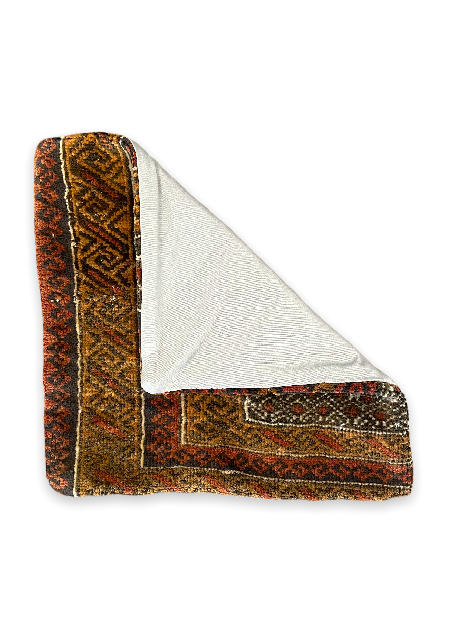 Wool rug face with coordinating fabric backing. All sizes are approximate. Age-related wear and patina are considered normal in these unique, hand woven pieces. All items have been photographed with moderate natural light. Colors may vary depending on your phone or screen settings. Some items may not be perfectly straight. We consider these characteristics part of what makes them truly one-of-a-kind.