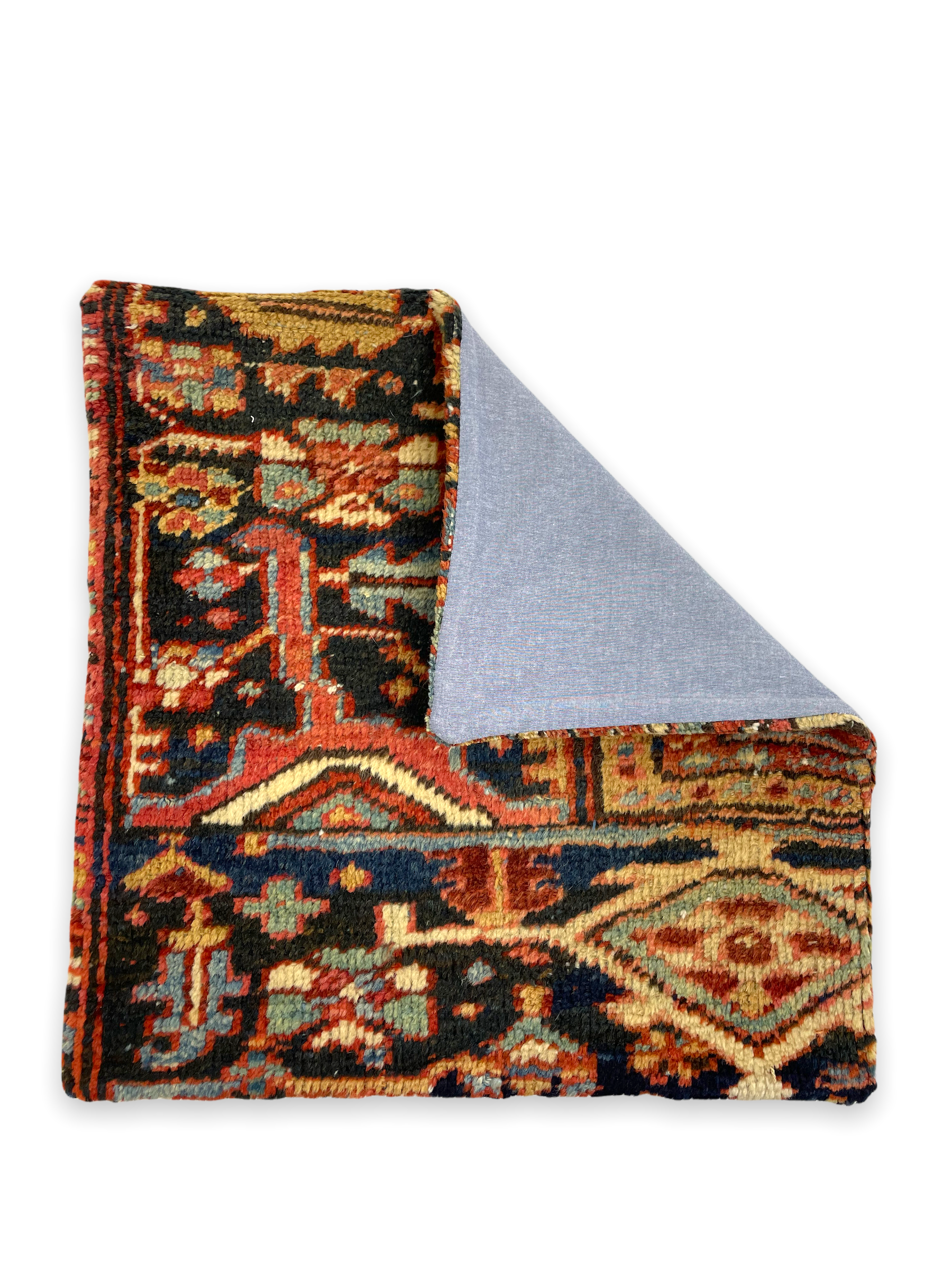 Wool rug face with coordinating fabric backing. All sizes are approximate. Age-related wear and patina are considered normal in these unique, hand woven pieces. All items have been photographed with moderate natural light. Colors may vary depending on your phone or screen settings. Some items may not be perfectly straight. We consider these characteristics part of what makes them truly one-of-a-kind.