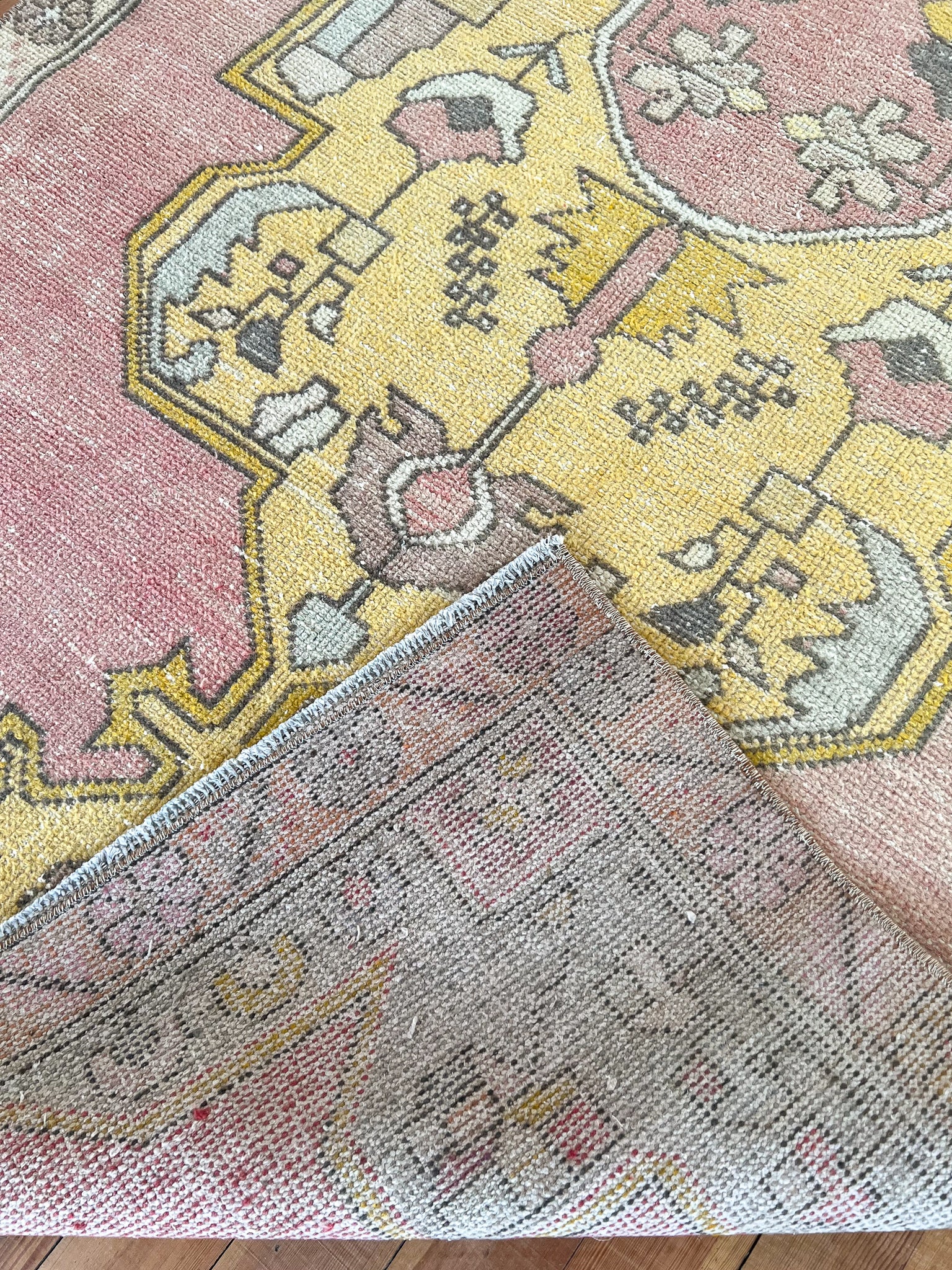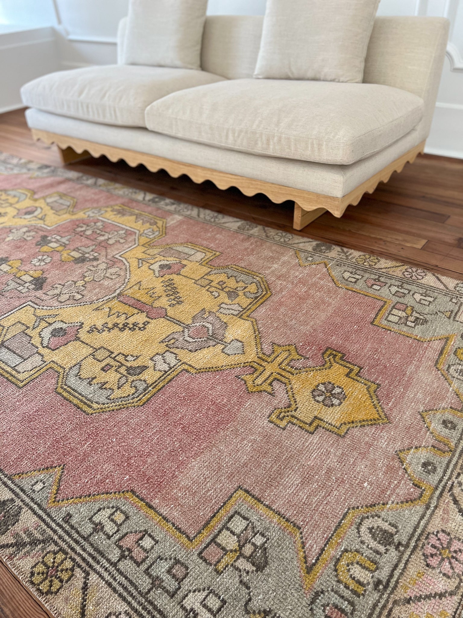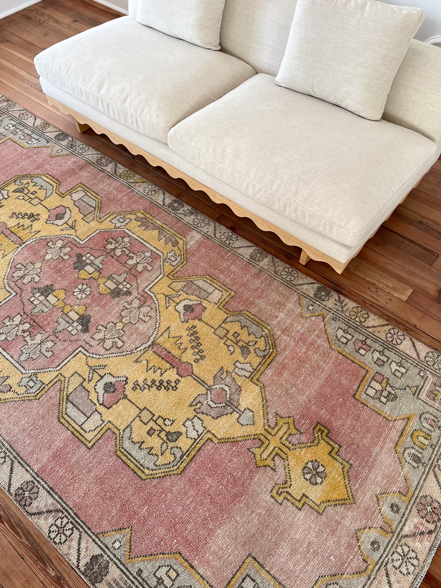 All rugs have been thoroughly cleaned; age-related wear and patina are considered normal in these unique, hand-woven vintage rugs. All pieces have been photographed with moderate natural light. In some cases, photos are edited to depict the most true-to-life colors. Colors may vary depending on your phone or screen settings. Some items may not be perfectly straight or rectangle. We consider these characteristics part of what makes them truly one-of-a-kind.
