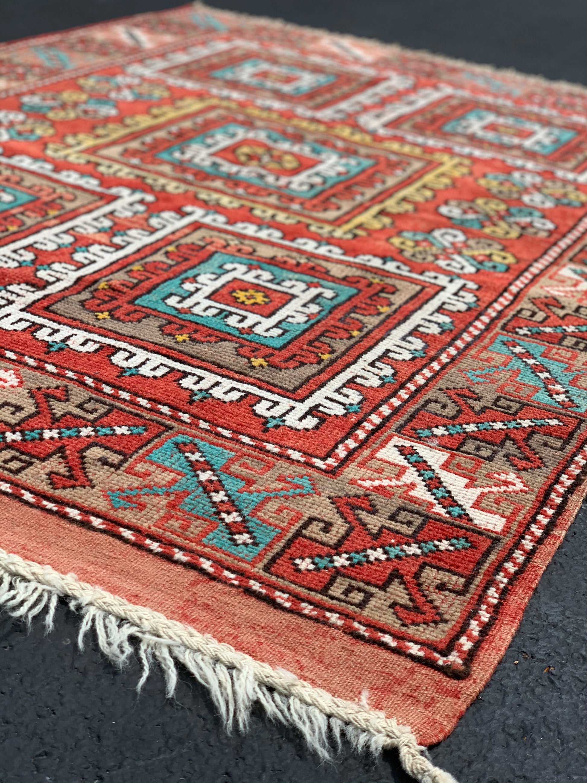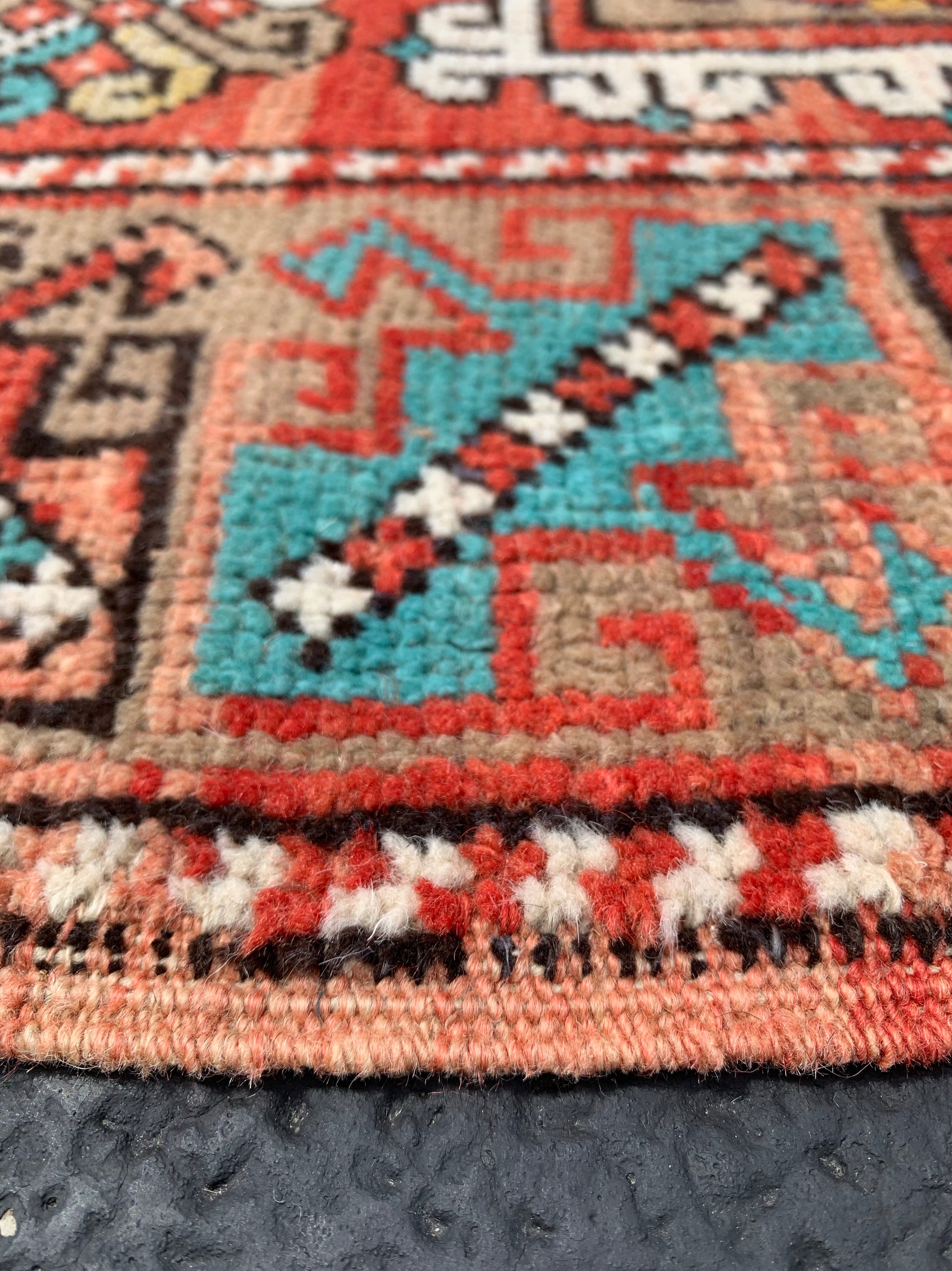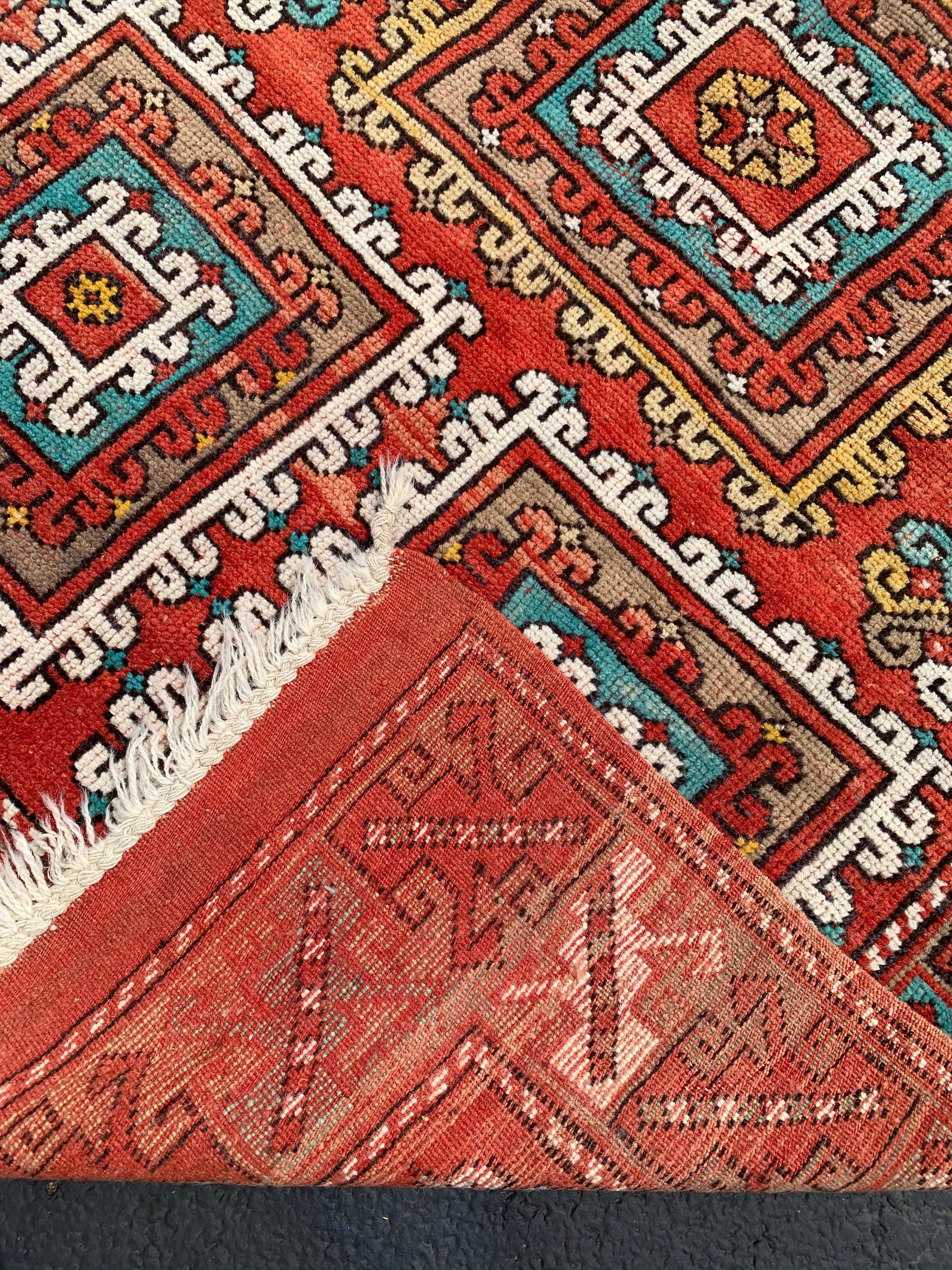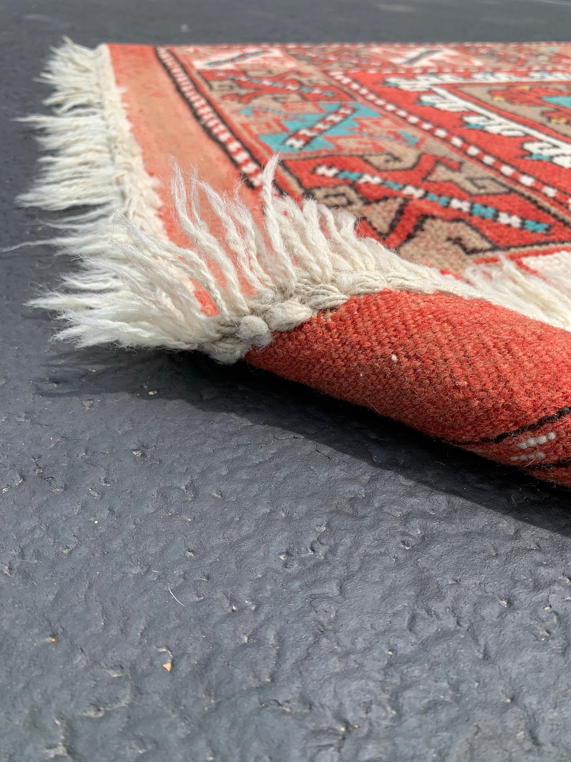 All rugs have been thoroughly cleaned; age-related wear and patina are considered normal in these unique, hand woven vintage rugs. All pieces have been photographed with moderate natural light. Colors may vary depending on your phone or screen settings. Some items may not be perfectly straight or rectangle. We consider these characteristics part of what makes them truly one-of-a-kind.