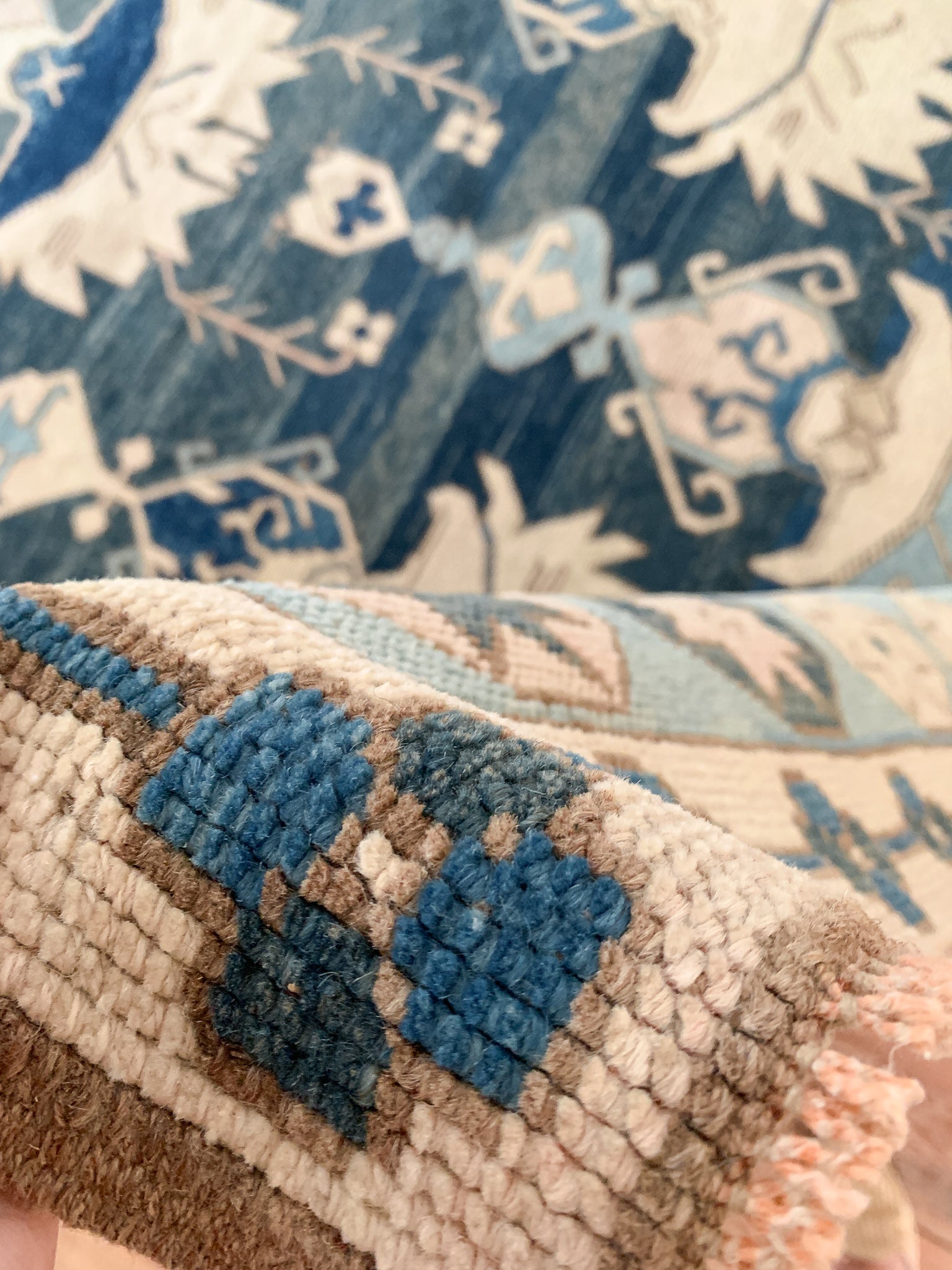 Each rug listed on our site is either a wool pile on a cotton foundation or a wool pile on a wool foundation. Quality, unrefined wool contains a substance called lanolin. Lanolin tends to have a natural smell, which many compare to the smell of sheep – or almost metallic-y, but sweet and grassy.