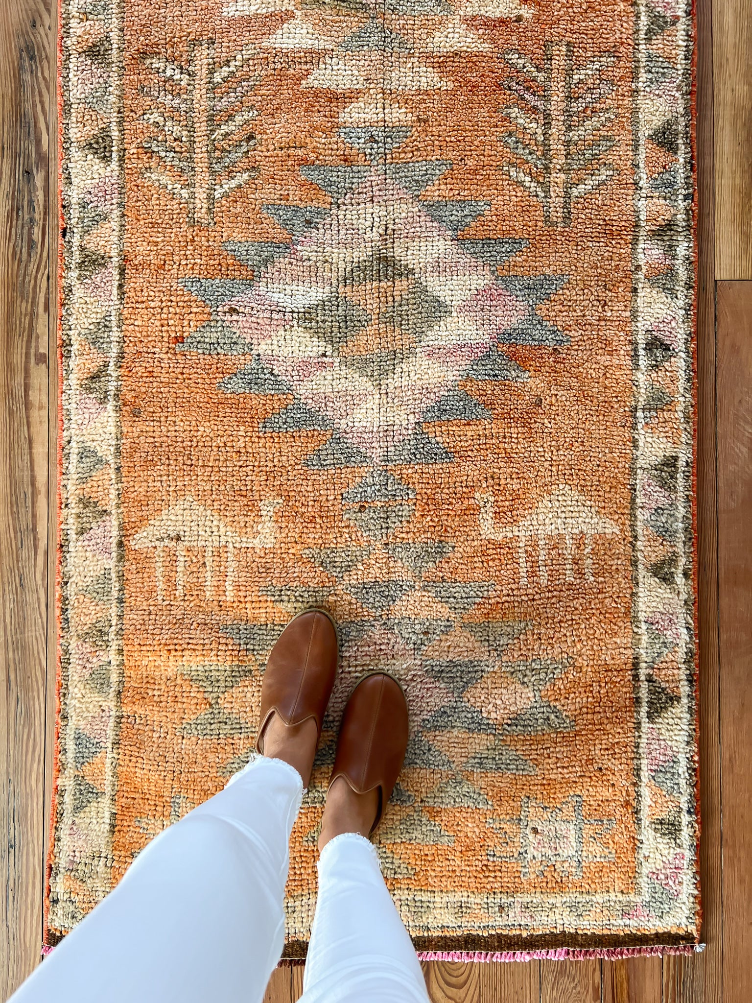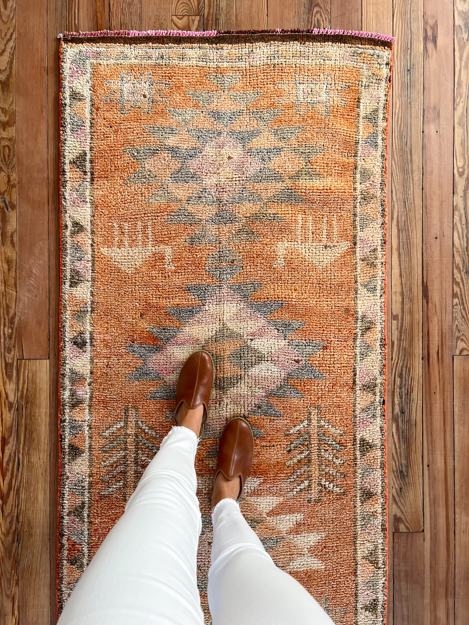 All rugs have been thoroughly cleaned; age-related wear and patina are considered normal in these unique, hand-woven vintage rugs. All pieces have been photographed with moderate natural light. In some cases, photos are edited to depict the most true-to-life colors. Colors may vary depending on your phone or screen settings. Some items may not be perfectly straight or rectangle. We consider these characteristics part of what makes them truly one-of-a-kind.
